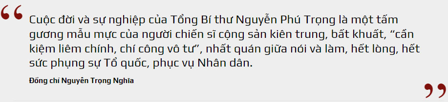 Cán bộ, đảng viên, nhân dân trong nước, kiều bào ta ở nước ngoài và bạn bè quốc tế đều bày tỏ sự yêu mến, kính trọng tài năng, đạo đức cách mạng, lối sống thanh bạch, chân tình của Tổng Bí thư Nguyễn Phú Trọng.
