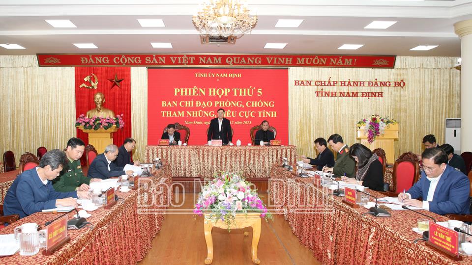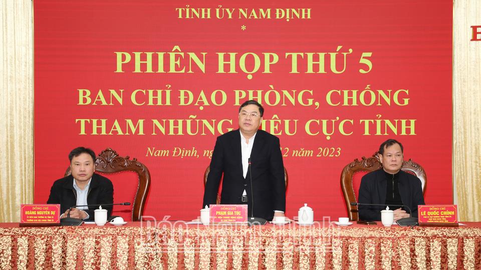 Theo báo cáo tại phiên họp, năm 2023, công tác phòng, chống tham nhũng, tiêu cực tiếp tục được cấp ủy, chính quyền các cấp trong tỉnh quan tâm lãnh đạo, chỉ đạo mạnh mẽ, quyết liệt, đồng bộ và đạt nhiều kết quả toàn diện được cán bộ, đảng viên và nhân dân tin tưởng, đồng tình, ủng hộ. Ban Chỉ đạo đã tham mưu Thường trực, Ban Thường vụ Tỉnh ủy lãnh đạo, chỉ đạo triển khai thực hiện kịp thời, đầy đủ các nghị quyết, chỉ thị, quy định của Trung ương và ban hành nhiều văn bản lãnh đạo, chỉ đạo công tác phòng, chống tham nhũng, lãng phí, tiêu cực trên địa bàn tỉnh. Trong đó đã triển khai thực hiện nghiêm các Kết luận của Ban Chỉ đạo Trung ương, Thường trực Ban Chỉ đạo Trung ương đối với công tác phòng, chống tham nhũng, tiêu cực. Thực hiện nghiêm chế độ làm việc, tiến hành 4 phiên họp Ban Chỉ đạo, 8 cuộc họp Thường trực Ban Chỉ đạo; tiến hành kiểm tra đối với một số cấp ủy cấp huyện liên quan đến công tác phòng, chống tham nhũng, tiêu cực; tổ chức tập huấn công tác phòng, chống tham nhũng, tiêu cực cho người đứng đầu các cấp ủy, tổ chức đảng, các cơ quan, đơn vị và cán bộ tham mưu công tác nội chính, phòng, chống tham nhũng, tiêu cực, cải cách tư pháp trên địa bàn tỉnh. Bên cạnh đó, công tác thanh tra, kiểm tra, giám sát về phòng, chống tham nhũng, tiêu cực được tăng cường, Ban TVTU đã kiểm tra đối với 5 tổ chức đảng, 5 đảng viên; giám sát 8 tổ chức đảng, 8 đảng viên; Ban Chỉ đạo đã kiểm tra đối với 4 tổ chức đảng; Thanh tra tỉnh đã tiến hành các cuộc thanh tra đột xuất theo chỉ đạo của Trung ương, của tỉnh. Đặc biệt, Đảng ủy Công an tỉnh, Ban cán sự đảng Viện Kiểm sát nhân dân tỉnh, Ban cán sự đảng Tòa án nhân dân tỉnh đã tập trung chỉ đạo, phối hợp chặt chẽ trong công tác xác minh, điều tra, xử lý đối với các vụ án, vụ việc tham nhũng, tiêu cực, nhất là 8 vụ án, vụ việc thuộc diện Ban Chỉ đạo theo dõi, chỉ đạo bảo đảm đúng tiến độ. Đến nay đã xét xử sơ thẩm 2 vụ án gồm: vụ “Làm giả tài liệu của cơ quan, tổ chức”, “Vi phạm các quy định về sử dụng đất đai” xảy ra tại Công ty Cổ phần Dịch vụ tang lễ Hoàng Long, Hội đồng xét xử tuyên phạt bị cáo Trần Đình Giao 3 năm 6 tháng tù về tội “Làm giả tài liệu của cơ quan, tổ chức”, 1 năm 6 tháng tù về tội “Vi phạm các quy định về sử dụng đất đai”, tổng hợp hình phạt là 5 năm tù; bị cáo Đỗ Minh Tiến 3 năm tù; bị cáo Trần Thị Hoan, Phạm Thị Hoa 2 năm tù về tội “Làm giả tài liệu của cơ quan, tổ chức”. Do các bị cáo có đơn kháng cáo, ngày 18-7-2023, Tòa án nhân dân Cấp cao tại Hà Nội đã mở phiên tòa xét xử phúc thẩm vụ án hình sự đối với bị cáo Trần Đình Giao và đồng phạm. Hội đồng xét xử đã tuyên phạt bị cáo Trần Đình Giao y án sơ thẩm là 5 năm tù; bị cáo Đỗ Minh Tiến 2 năm 6 tháng tù, bị cáo Trần Thị Hoan, Phạm Thị Hoa 21 tháng tù. Ngày 29-11-2023, Tòa án nhân dân tỉnh Nam Định đã mở phiên tòa xét xử sơ thẩm vụ án “Vi phạm quy định về đấu thầu gây hậu quả nghiêm trọng” và “Tham ô tài sản” xảy ra tại CDC Nam Định. Hội đồng xét xử đã tuyên phạt các bị cáo: Đỗ Đức Lưu 13 năm tù về tội “Nhận hối lộ”, 3 năm 6 tháng tù về tội “Vi phạm quy định về đấu thầu gây hậu quả nghiêm trọng”, tổng hợp hình phạt là 16 năm 6 tháng tù; Vũ Ngọc Tuyên 15 năm tù về tội “Nhận hối lộ”, 3 năm tù về tội “Vi phạm quy định về đấu thầu gây hậu quả nghiêm trọng”, tổng hợp hình phạt là 18 năm tù; Phạm Thị Nga, Vũ Khánh Vân 21 tháng tù về tội “Vi phạm quy định về đấu thầu gây hậu quả nghiêm trọng”; Vũ Thị Ngọc Thanh 15 năm tù về tội “Tham ô tài sản”; Nguyễn Thị Phương Thảo, Lâm Thị Hà 36 tháng tù; Vũ Thị Yến 27 tháng tù về tội “Tham ô tài sản”.