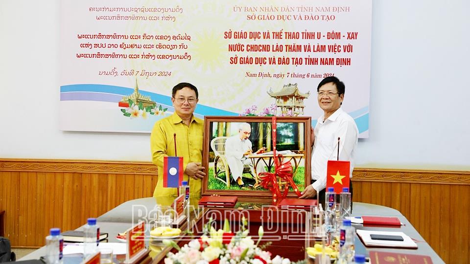 | Đồng chí Cao Xuân Hùng, Giám đốc Sở GD và ĐT tỉnh Nam Định trao tặng Sở GD và TT tỉnh U Đôm Xay bức ảnh chân dung Chủ tịch Hồ Chí Minh. |