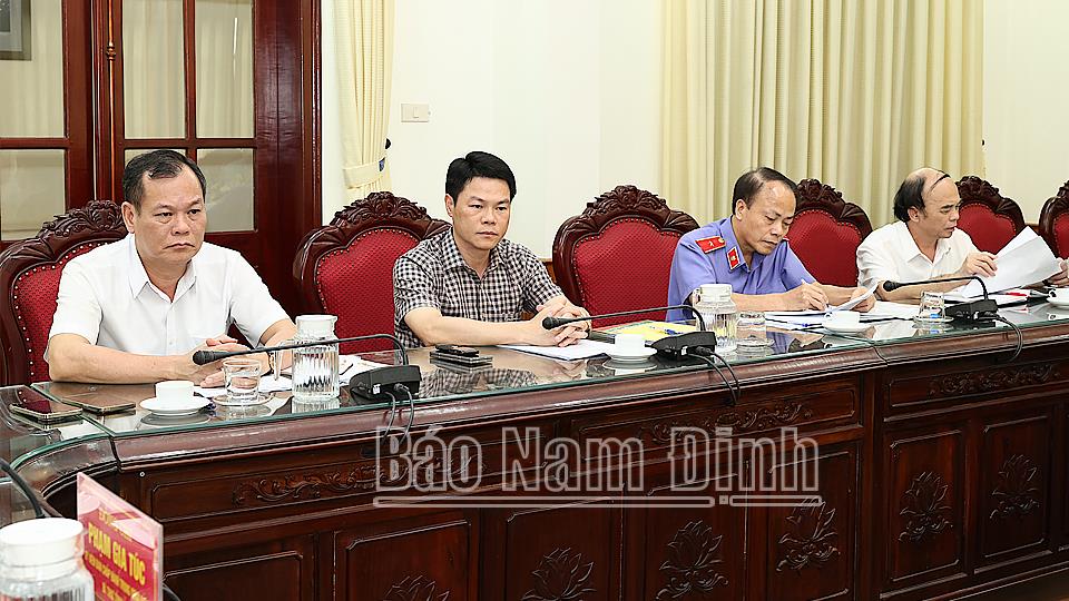 Phiên họp đã nghe báo cáo tổng hợp của Ban Nội chính Tỉnh ủy - Cơ quan Thường trực Ban Chỉ đạo và ý kiến phát biểu của các đồng chí: Giám đốc Công an tỉnh - Phó Trưởng Ban Chỉ đạo; Viện trưởng Viện Kiểm sát nhân dân tỉnh, Chánh án Tòa án nhân dân tỉnh - Ủy viên Ban Chỉ đạo về tình hình, tiến độ, kết quả xử lý đối với các vụ án, vụ việc thuộc diện theo dõi, chỉ đạo của Ban Chỉ đạo. Cụ thể, Cơ quan An ninh điều tra Công an tỉnh đã ra quyết định khởi tố bị can, lệnh bắt bị can để tạm giam đối với Đinh Thị Ngọc Ánh về tội “Lợi dụng quyền tự do dân chủ xâm phạm lợi ích Nhà nước, quyền, lợi ích hợp pháp của tổ chức, cá nhân” xảy ra trên không gian mạng liên quan đến khu vực Cồn Xanh, huyện Nghĩa Hưng để tiến hành điều tra theo quy định của pháp luật. Cơ quan Cảnh sát điều tra Công an tỉnh ra quyết định khởi tố và ra lệnh bắt bị can để tạm giam đối với 3 bị can nguyên là lãnh đạo xã Nghĩa Thành, huyện Nghĩa Hưng về tội: “Lợi dụng chức vụ, quyền hạn trong khi thi hành công vụ” gồm: Phạm Ngọc Quyến, nguyên Chủ tịch UBND xã Nghĩa Thành giai đoạn 2010-2015; Trần Văn An, Phó Chủ tịch UBND xã Nghĩa Thành giai đoạn 2015-2020, Chủ tịch UBND xã Nghĩa Thành giai đoạn 2020-2023, nay là Chủ tịch UBND xã Phúc Thắng; Đào Văn Vân, Phó Chủ tịch UBND xã Nghĩa Thành giai đoạn 2010-2015.