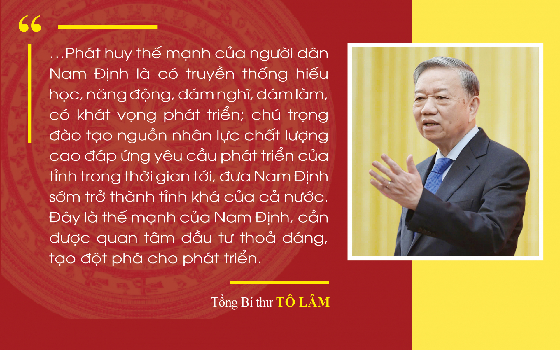 Phát biểu tại buổi về thăm và làm việc với Ban Chấp hành Đảng bộ tỉnh Nam Định trong đầu năm mới (tháng 1/2025), Tổng Bí thư Tô Lâm tin tưởng: Với truyền thống và tiềm năng, lợi thế sẵn có, cùng với sự đoàn kết, thống nhất, tự lực, tự cường và khát vọng phát triển của Đảng bộ, chính quyền và nhân dân, tỉnh Nam Định sẽ hoàn thành tốt các chỉ tiêu nhiệm vụ đã đề ra, góp phần cùng cả nước thực hiện thắng lợi Nghị quyết Đại hội lần thứ XIII của Đảng, đưa Nam Định phát triển nhanh, bền vững, toàn diện, nhân dân ngày càng có cuộc sống ấm no, hạnh phúc.