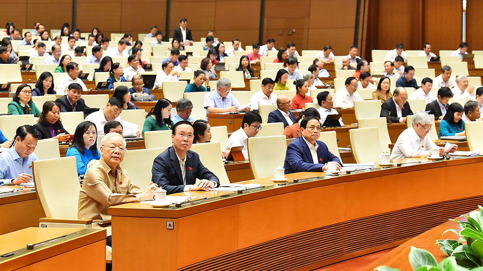 | Tổng Bí thư Nguyễn Phú Trọng, Chủ tịch nước Võ Văn Thưởng, Thủ tướng Phạm Minh Chính và các đại biểu dự phiên thảo luận sáng 1-11. |