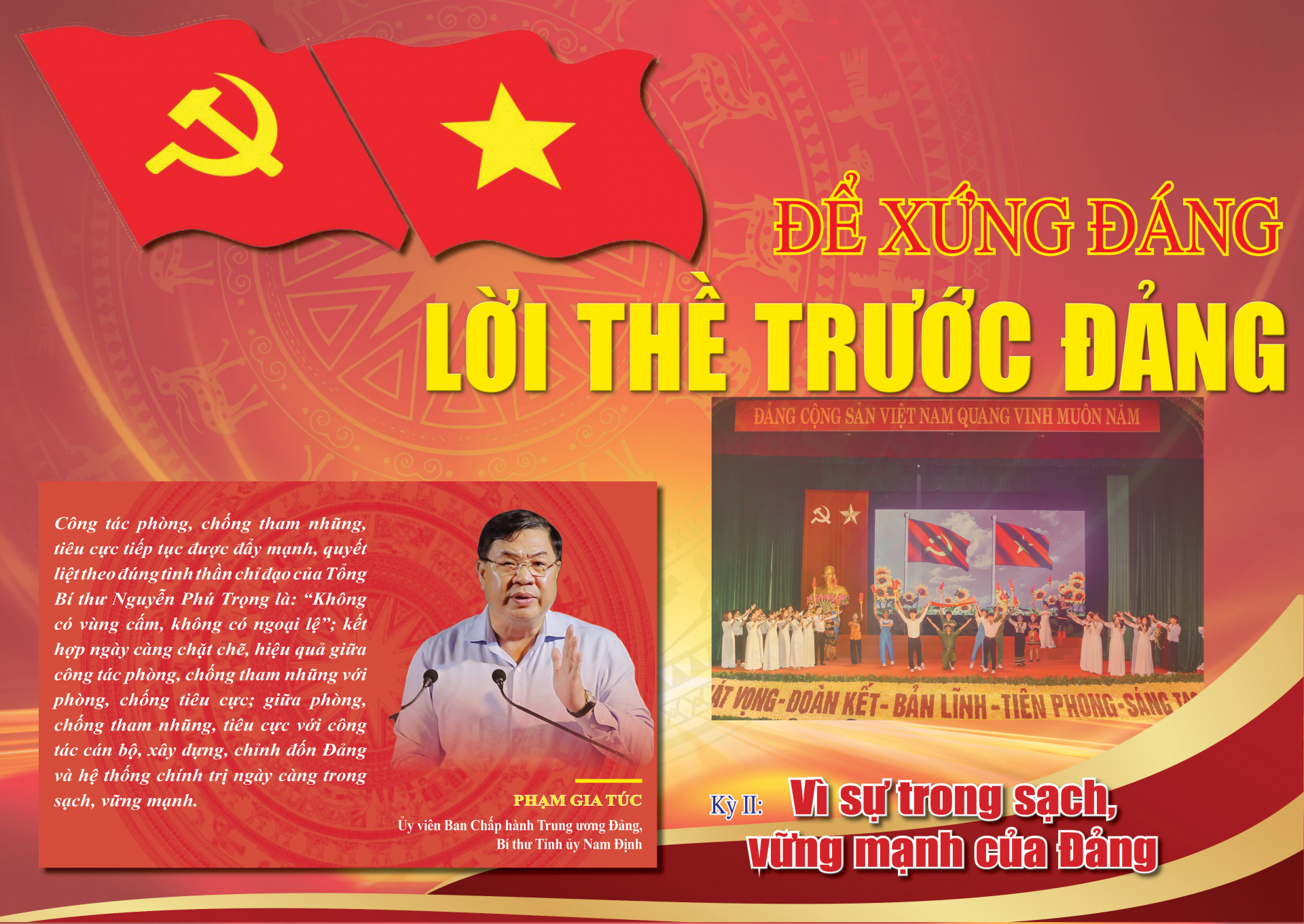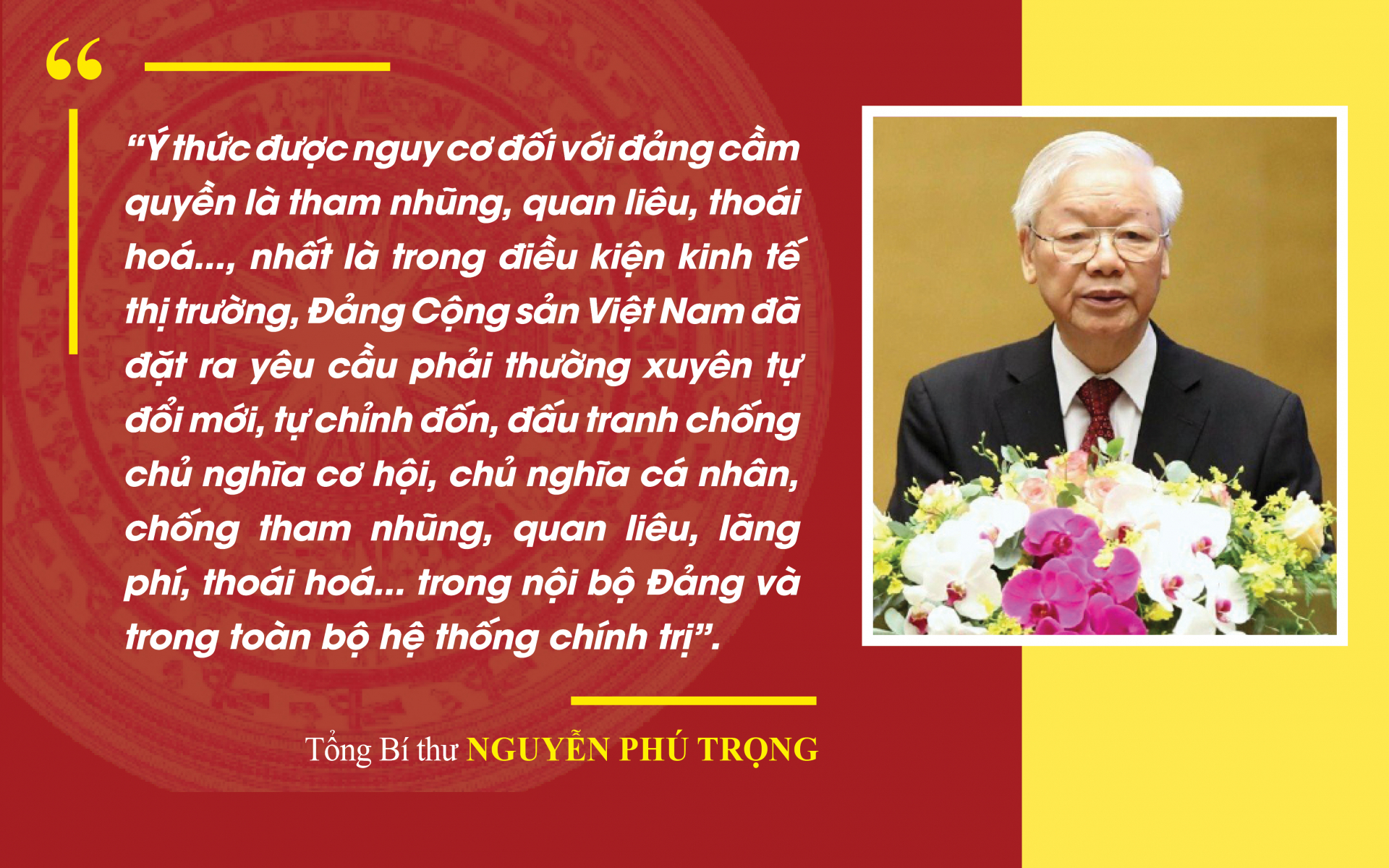Trong bài viết Tự hào và tin tưởng dưới lá cờ vẻ vang của Đảng, quyết tâm xây dựng một nước Việt Nam ngày càng giàu mạnh, văn minh, văn hiến và anh hùng, Tổng Bí thư Nguyễn Phú Trọng thẳng thắn nêu: “Ý thức được nguy cơ đối với đảng cầm quyền là tham nhũng, quan liêu, thoái hoá..., nhất là trong điều kiện kinh tế thị trường, Đảng Cộng sản Việt Nam đã đặt ra yêu cầu phải thường xuyên tự đổi mới, tự chỉnh đốn, đấu tranh chống chủ nghĩa cơ hội, chủ nghĩa cá nhân, chống tham nhũng, quan liêu, lãng phí, thoái hoá... trong nội bộ Đảng và trong toàn bộ hệ thống chính trị”.
