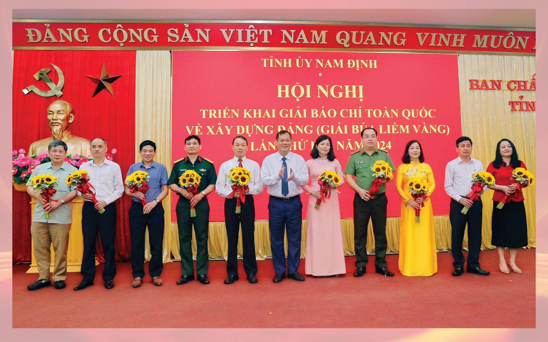 | Đồng chí Phó Bí thư Thường trực Tỉnh ủy Lê Quốc Chỉnh tặng hoa các tập thể có thành tích tiêu biểu trong triển khai Giải Báo chí toàn quốc về xây dựng Đảng (Giải Búa liềm vàng) lần thứ VIII-2023. |