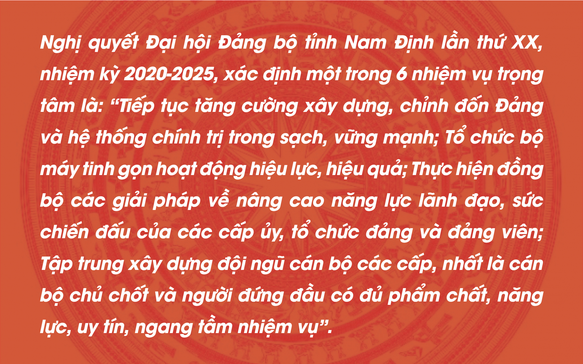 Trong thời gian tới, Tỉnh ủy, Ban Thường vụ Tỉnh ủy Nam Định tiếp tục: Đẩy mạnh, nâng cao hiệu quả, tạo sự chuyển biến trong công tác xây dựng Đảng về chính trị, tư tưởng, đạo đức, tổ chức bộ máy, công tác cán bộ, cơ sở đảng và đảng viên, kiểm tra, giám sát, đấu tranh phòng, chống tham nhũng, tiêu cực, công tác dân vận, đổi mới phương thức lãnh đạo, cầm quyền của Đảng. Chú trọng công tác xây dựng, chỉnh đốn Đảng và hệ thống chính trị.
