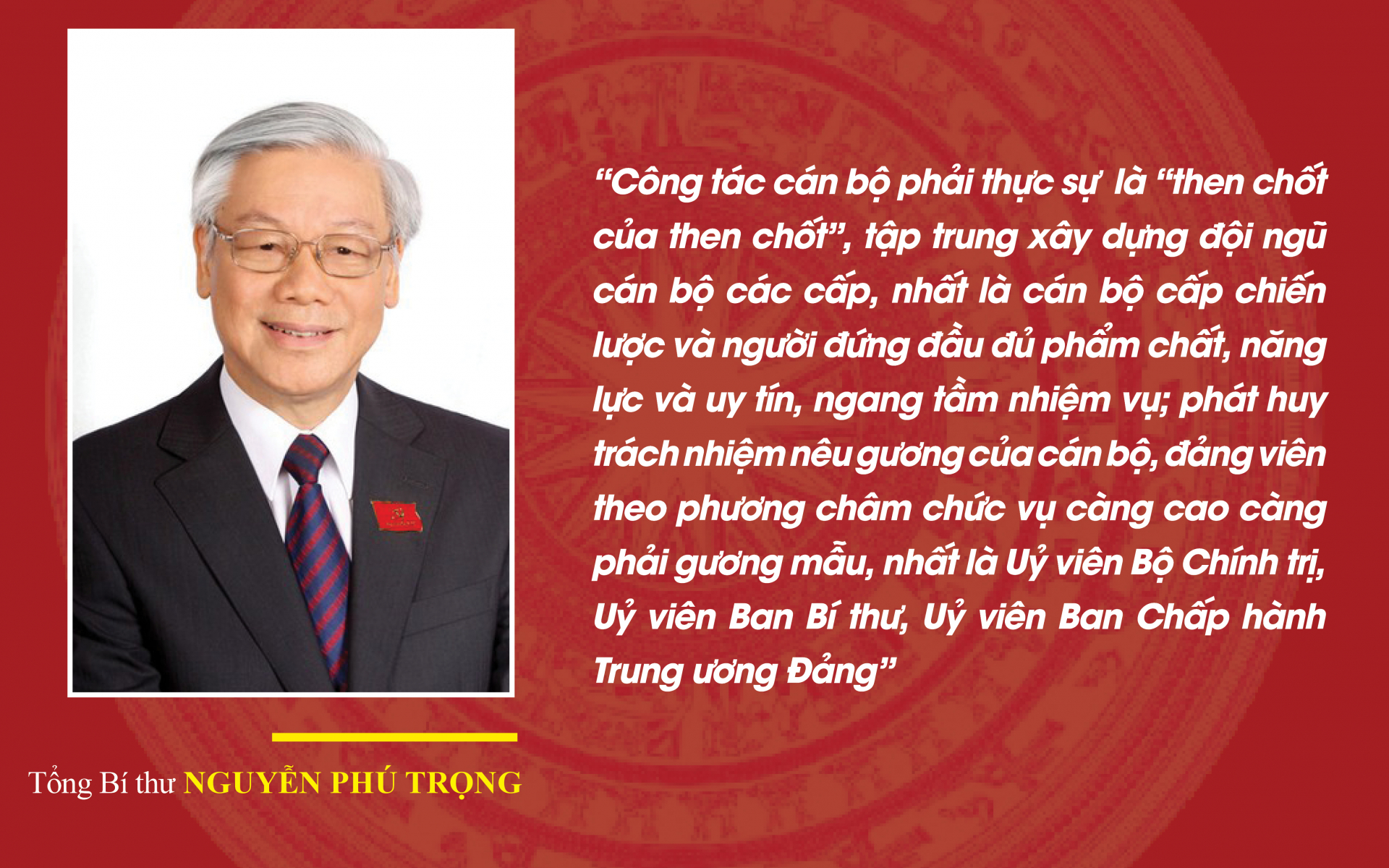 | “Cán bộ là cái gốc của mọi công việc. Muôn việc thành công hoặc thất bại, đều do cán bộ tốt hoặc kém”. (CHỦ TỊCH HỒ CHÍ MINH) |