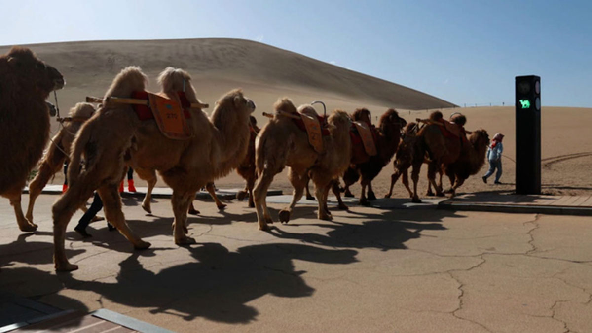 Một đèn giao thông mới được lắp đặt tại Khu thắng cảnh núi Minh Sa và suối Nguyệt Nha ở thành phố Đôn Hoàng, tỉnh Cam Túc vào tháng 4. Hệ thống này ra đời nhằm chấm dứt tình trạng giao thông hỗn loạn tại nút giao nhau giữa lối đi bộ lát ván dành cho khách du lịch và đường đi của lạc đà. Ảnh: VCG
