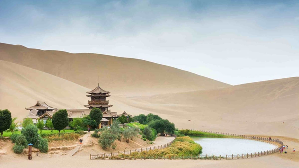 Đây cũng là một điểm du lịch hút khách nhờ những cồn cát ngọn mục bao quanh một ốc đảo, khung cảnh mùa đông ngoạn mục khi tuyết phủ trắng sa mạc. Thắng cảnh này nằm gần thành phố Đôn Hoàng, rìa sa mạc Gobi và nó từng là điểm dừng chân của du khách trên Con đường Tơ lụa. Ảnh: CGTN