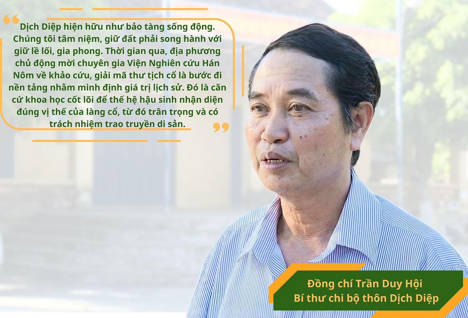 Đồng chí Trần Duy Hội, Bí thư chi bộ thôn Dịch Diệp chia sẻ: Mặc dù đã trải qua hơn một thiên niên kỷ, Dịch Diệp vẫn giữ được nhiều nét văn hóa truyền thống hiện hữu như bảo tàng sống động. Những giá trị văn hóa truyền thống của quê hương vẫn được lưu giữ, bảo tồn và truyền lại cho các thế hệ con cháu.