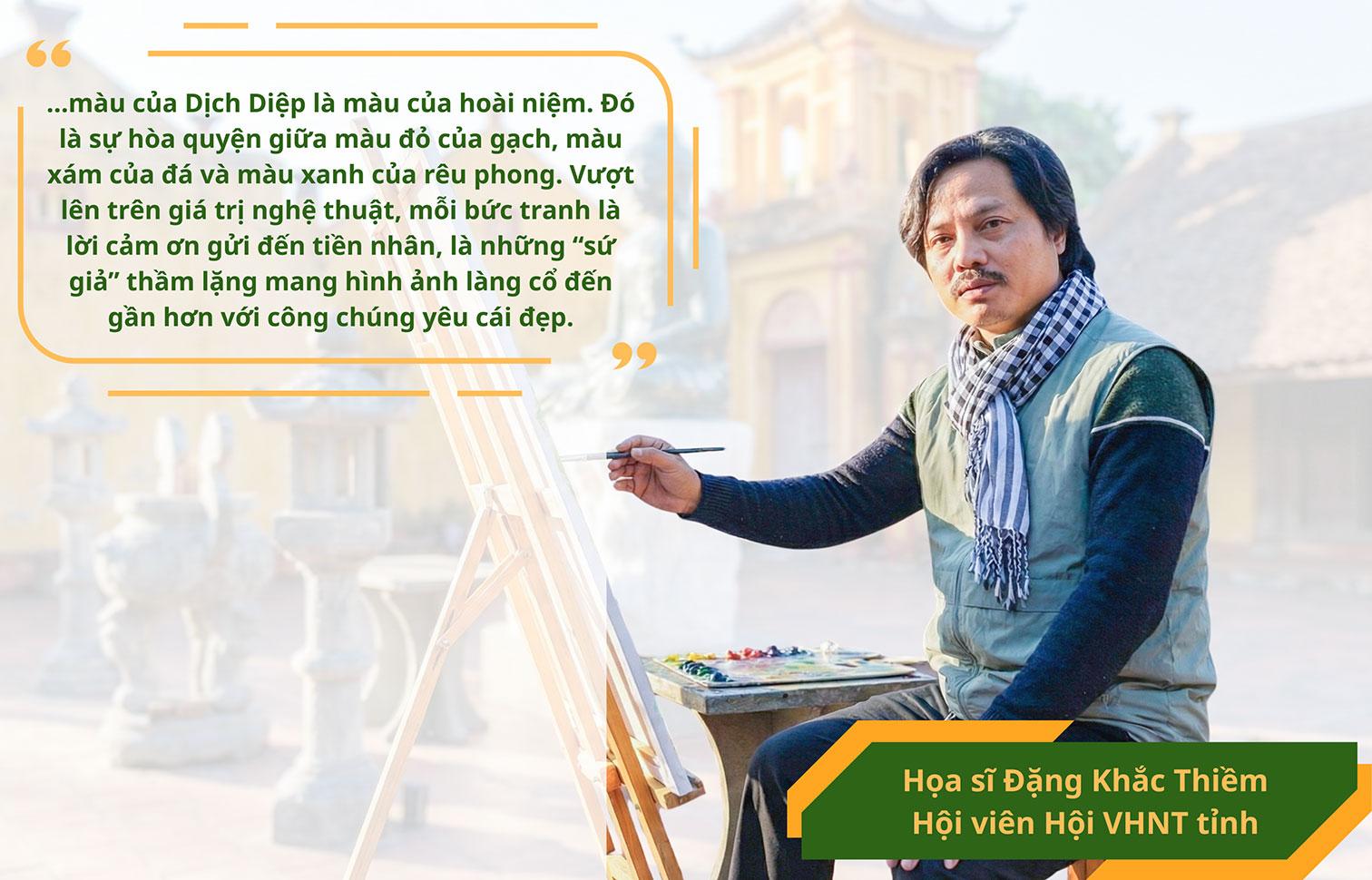 Đồng điệu với các nhiếp ảnh gia, giới mỹ thuật coi ngôi làng là bảng màu vô tận. Họa sĩ Đặng Khắc Thiềm, người dành nhiều tâm huyết ký họa tại đây, cho rằng màu của Dịch Diệp là màu của hoài niệm, là đề tài và chất liệu sáng tạo đặc sắc.