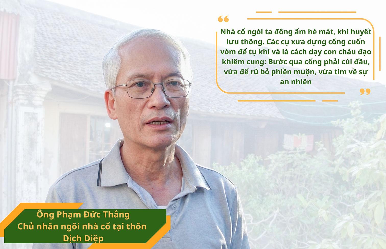 Là chủ nhân một nếp nhà cổ còn nguyên vẹn, ông Phạm Đức Thắng cho biết: Trước làn sóng bê tông hóa, khi con cháu có ý định phá cổng cũ xây tường bao, tôi kiên quyết gạt đi với tâm niệm giữ cổng đâu đơn thuần là giữ đất, mà cốt lõi là giữ lề lối gia phong, là neo giữ gốc tích của chính mình.