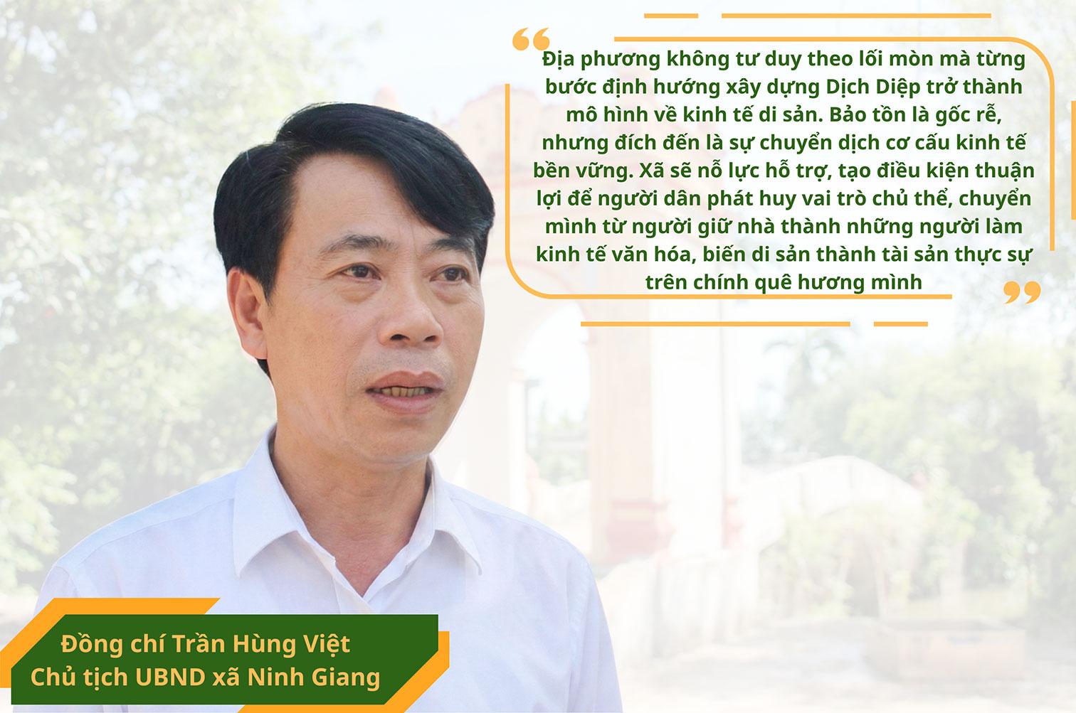 Trao đổi về định hướng phát triển du lịch thôn Dịch Diệp, đồng chí Trần Hùng Việt, Chủ tịch UBND xã Ninh Giang cho biết: “Địa phương đang từng bước định hướng xây dựng Dịch Diệp trở thành mô hình về kinh tế di sản. Bảo tồn là gốc rễ, nhưng đích đến là sự chuyển dịch cơ cấu kinh tế bền vững". Định hướng chiến lược từ chính quyền xã đã mở ra cánh cửa mới cho Dịch Diệp. Nhưng để hiện thực hóa khát vọng biến di sản thành tài sản, địa phương cần thêm những cú hích mạnh mẽ hơn nữa để phá vỡ thế “ốc đảo”. Thay vì chờ đợi hữu xạ tự nhiên hương, địa phương cần chủ động biến tiếng thoi đưa, nếp nhà cổ thành sản phẩm du lịch đặc thù; biến câu chuyện văn hóa thành trải nghiệm trả phí. Khi giải quyết được bài toán “lấy di sản nuôi di sản”, Dịch Diệp sẽ phát huy được giá trị của ngôi làng cổ nghìn năm tuổi.