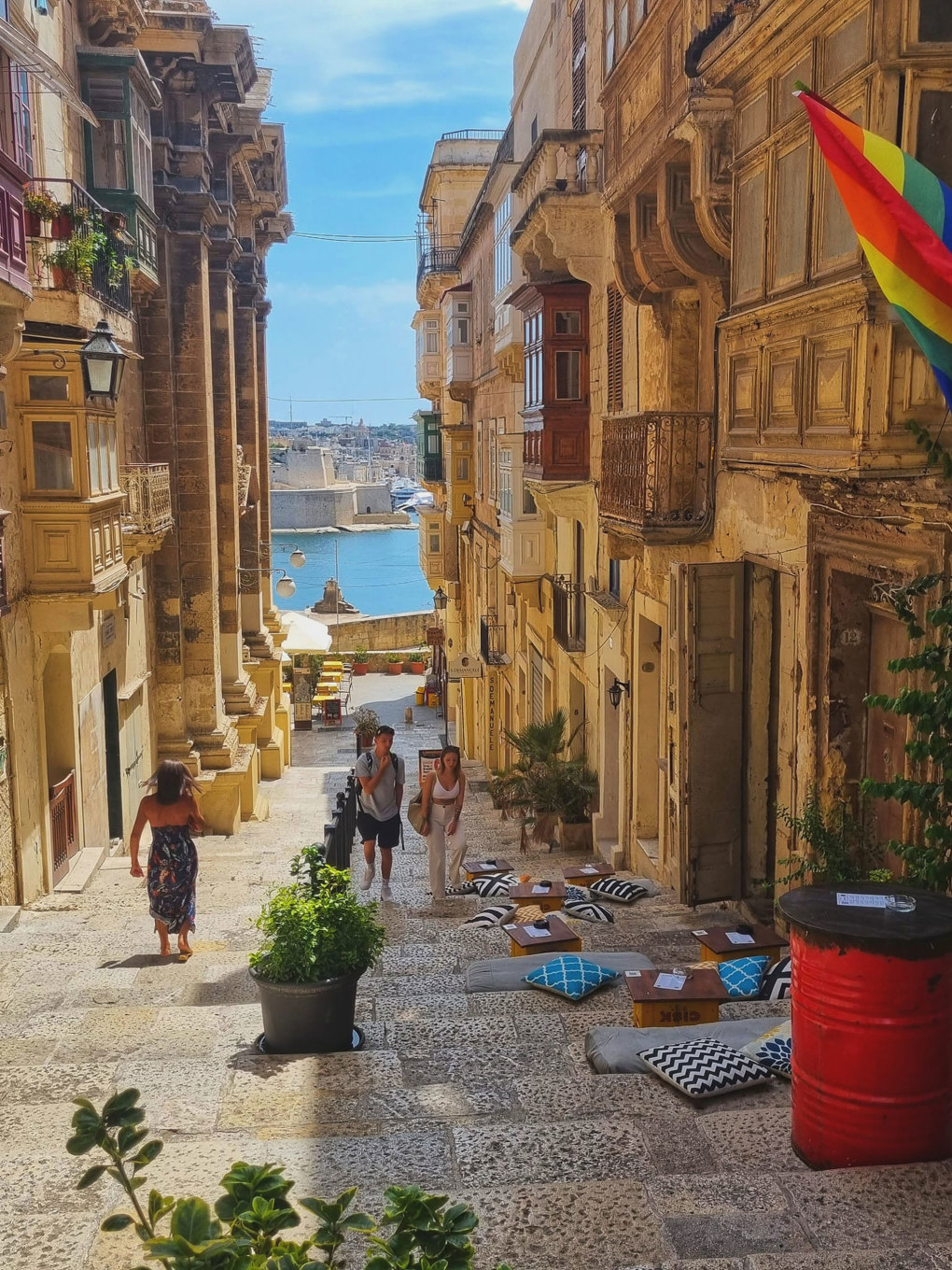 Quán cà phê nằm trong con hẻm nhỏ ở Malta, tầm nhìn ra biển và ghế là các bậc cầu thang đá. Ảnh: Toni Phạm