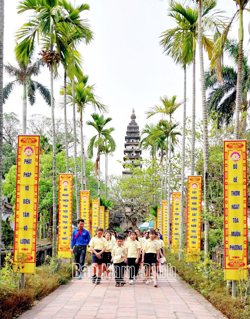 | Học sinh Trường Tiểu học Nguyễn Viết Xuân (thành phố Nam Định) trải nghiệm môn Lịch sử tại Đền Trần - Chùa Tháp. |