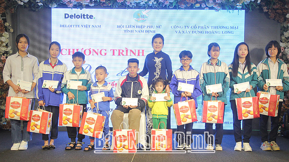 | Bà Đào Ngọc Thủy, Giám đốc Công ty Cổ phần Thương mại và Xây dựng Hoàng Long, Ủy viên BCH Hội LHPN tỉnh khóa XVII trao tặng quà cho học sinh THPT vượt khó học giỏi và trẻ em mồ côi trong chương trình “Mẹ đỡ đầu”. |