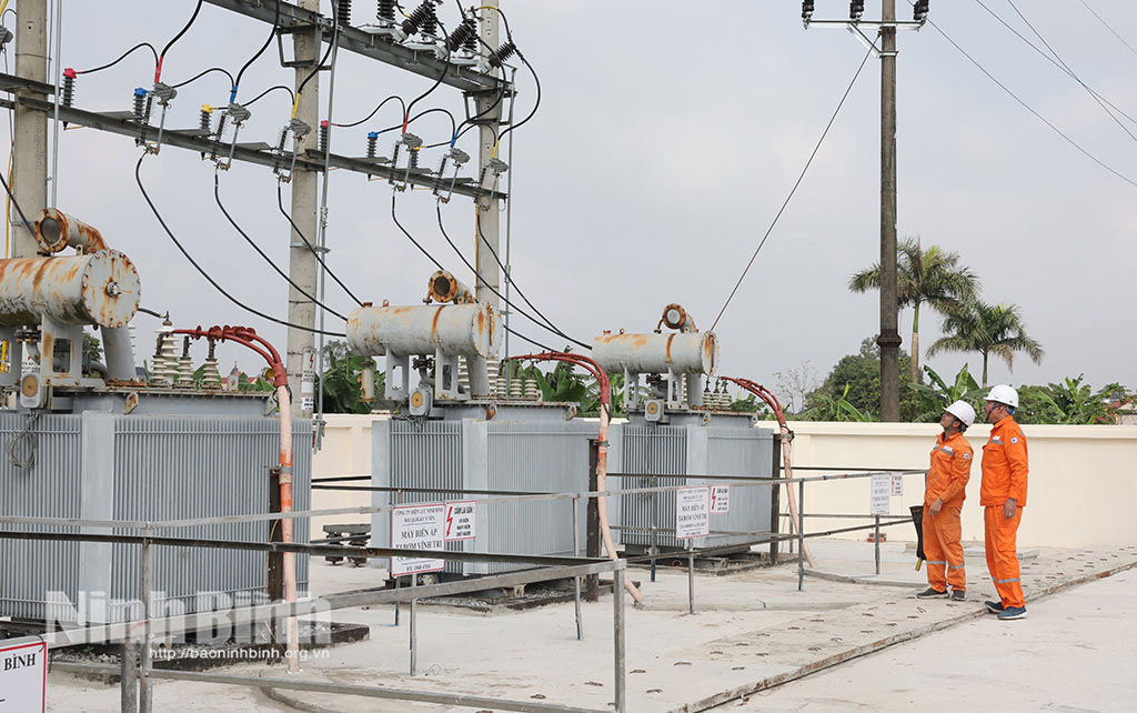 Lãnh đạo Công ty Điện lực Ninh Bình kiểm tra hệ thống biến thế tại Trạm bơm Cổ Đam (xã Phong Doanh).