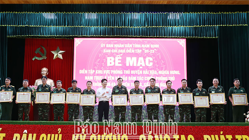 Thay mặt Ban chỉ đạo, Ban tổ chức diễn tập KVPT tỉnh, đồng chí Phó Chủ tịch Thường trực UBND tỉnh đã trao Bằng khen cho 7 tập thể, 16 cá nhân đạt thành tích xuất sắc trong cuộc diễn tập KVPT, bảo đảm tác chiến phòng thủ năm 2023.