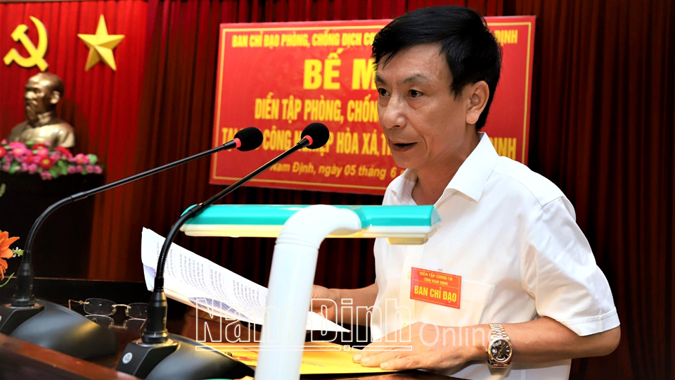 Phát biểu đánh giá buổi diễn tập, đồng chí Chủ tịch UBND tỉnh Phạm Đình Nghị biểu dương tinh thần trách nhiệm, sự nỗ lực cố gắng của các đơn vị đã tham gia tổ chức thành công cuộc diễn tập, trực tiếp là Bộ CHQS tỉnh, Công an tỉnh, Sở Y tế, Ban quản lý các khu công nghiệp, Ban Chỉ đạo phòng, chống dịch COVID-19 thành phố Nam Định; các lực lượng thực binh, lực lượng phục vụ đã đóng góp vào thành công của cuộc diễn tập. Thời gian tới Bộ CHQS tỉnh, Công an tỉnh, Sở Y tế, Trung tâm Kiểm soát bệnh tật tỉnh; Ban Chỉ đạo phòng, chống dịch các cấp, Ban quản lý các khu công nghiệp tiếp thu và chỉ đạo bổ sung vào phương án, kế hoạch phòng, chống dịch COVID-19. Để sẵn sàng ứng phó với mọi tình huống, diễn biến của dịch bệnh, bảo đảm sản xuất kinh doanh tại các khu công nghiệp, các ngành, các địa phương cần tập trung lãnh đạo, chỉ đạo, tiếp tục quán triệt thực hiện nghiêm các văn bản chỉ đạo của các cấp trong công tác phòng, chống dịch COVID-19 tại các khu công nghiệp. Trong đó Bộ CHQS tỉnh, Công an tỉnh, Sở Y tế làm tốt công tác tham mưu cho Tỉnh uỷ, HĐND, UBND tỉnh và phối hợp chặt chẽ với các sở, ban, ngành, đoàn thể tổ chức thực hiện hiệu quả nhiệm vụ phòng, chống dịch bệnh COVID-19, phát huy vai trò nòng cốt tuyến đầu chống dịch, không để dịch bệnh lây lan trên địa bàn. Ban quản lý các khu công nghiệp tỉnh hướng dẫn các doanh nghiệp, các khu công nghiệp thực hiện đầy đủ các biện pháp phòng, chống dịch COVID-19; thực hiện phương châm 4 tại chỗ, rà soát, khoanh vùng dập dịch. Thường xuyên theo dõi, hỗ trợ doanh nghiệp thực hiện cách ly chuyên gia, người lao động đến từ vùng dịch. Chủ động nắm tình hình khó khăn của doanh nghiệp, đề xuất tỉnh có biện pháp tháo gỡ khó khăn. Các huyện, thành phố chỉ đạo tổ chức thực hành diễn tập phòng, chống COVID-19 tại các khu, cụm công nghiệp; tiếp tục ưu tiên nguồn lực, thời gian cho công tác phòng, chống dịch; đẩy mạnh hỗ trợ, tạo điều kiện thuận lợi cho doanh nghiệp thúc đẩy phát triển sản xuất, kinh doanh cùng với kiểm soát tốt dịch bệnh COVID-19./.