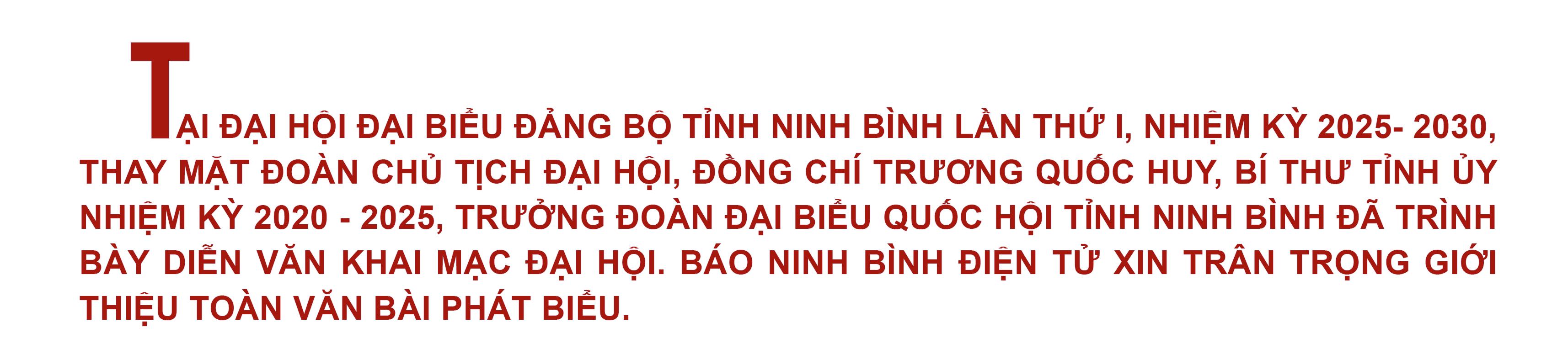 Hôm nay, trong không khí phấn khởi, tin tưởng, trách nhiệm chào mừng Đại hội đại biểu toàn quốc lần thứ XIV của Đảng; được sự nhất trí của Bộ Chính trị, Ban Bí thư Trung ương Đảng; Đảng bộ tỉnh Ninh Bình long trọng tổ chức Đại hội đại biểu Đảng bộ tỉnh lần thứ I, nhiệm kỳ 2025 - 2030. Đây là sự kiện chính trị có ý nghĩa đặc biệt quan trọng; là Đại hội đầu tiên của Đảng bộ tỉnh Ninh Bình sau khi được thành lập trên cơ sở hợp nhất 03 Đảng bộ tỉnh: Hà Nam, Nam Định, Ninh Bình khẳng định tinh thần đoàn kết, ý chí quyết tâm, phát huy tối đa tiềm năng, lợi thế của không gian phát triển mới, đưa tỉnh Ninh Bình bứt phá, tiến bước trong kỷ nguyên vươn mình của dân tộc.