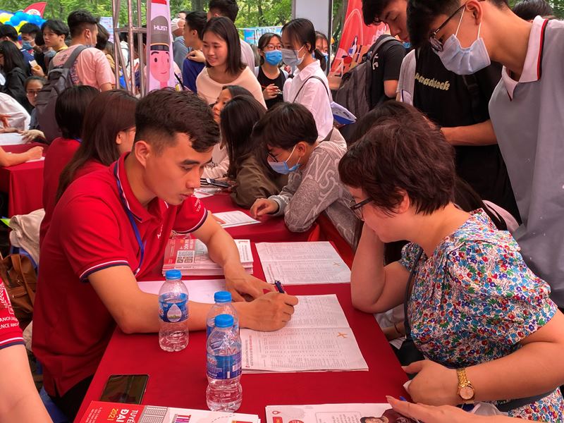 Cán bộ tuyển sinh Trường đại học Bách khoa Hà Nội tư vấn xét tuyển cho thí sinh, ngày 11/4.