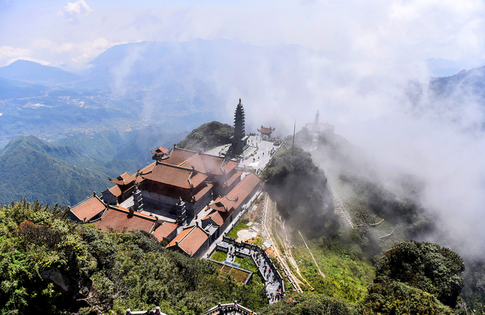 Quần thể tâm linh gần đỉnh Fansipan mờ ảo trong mây. Ảnh: Giang Huy.