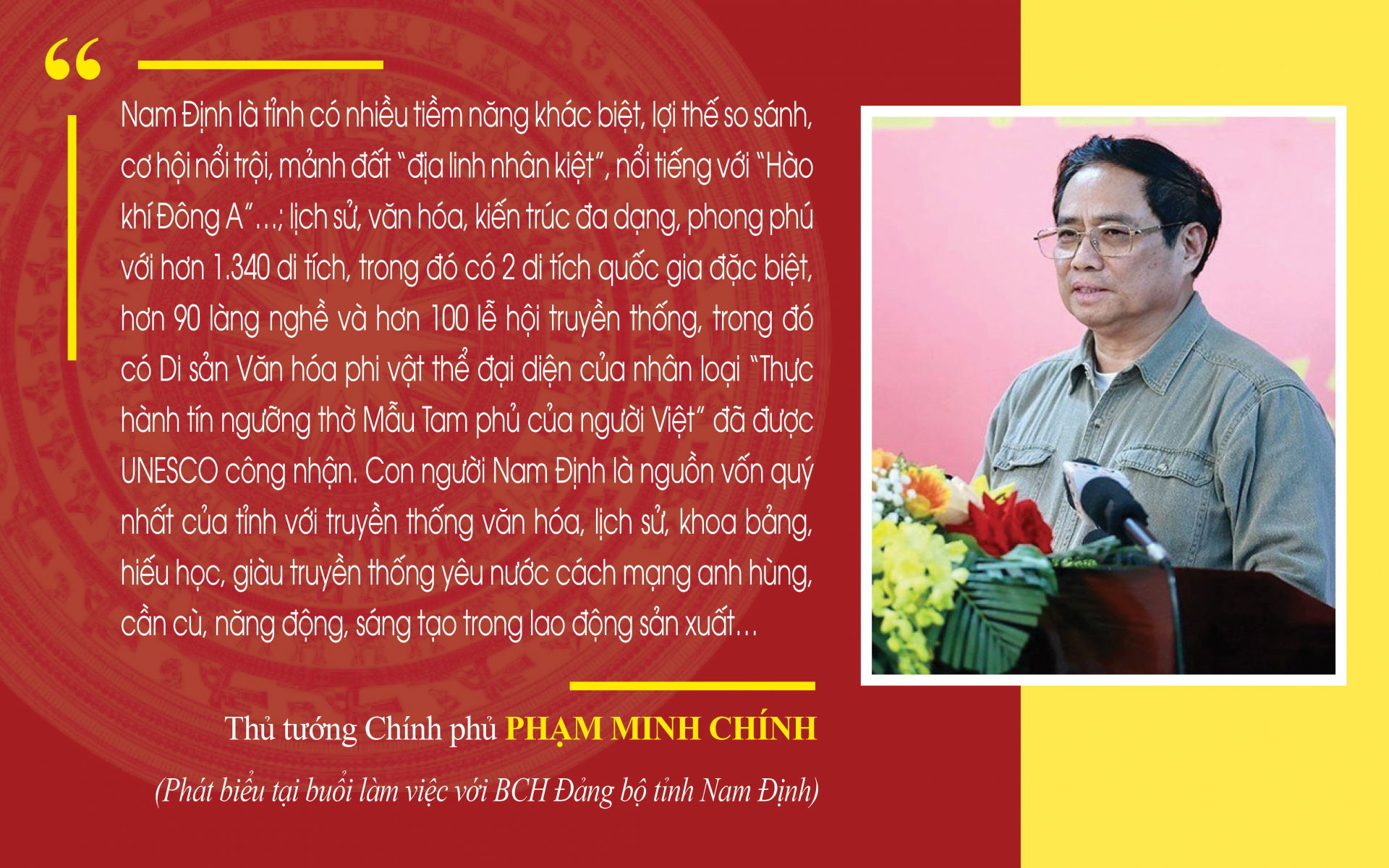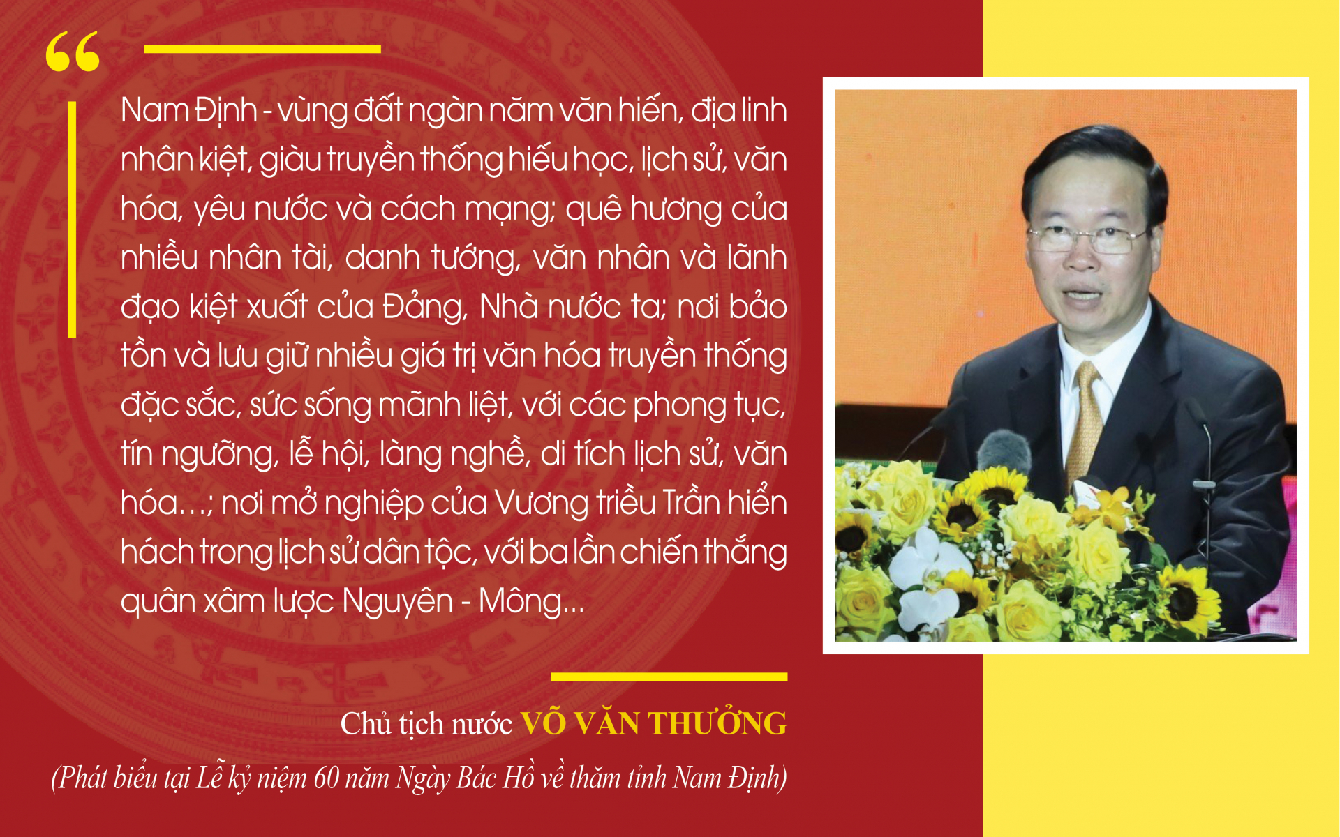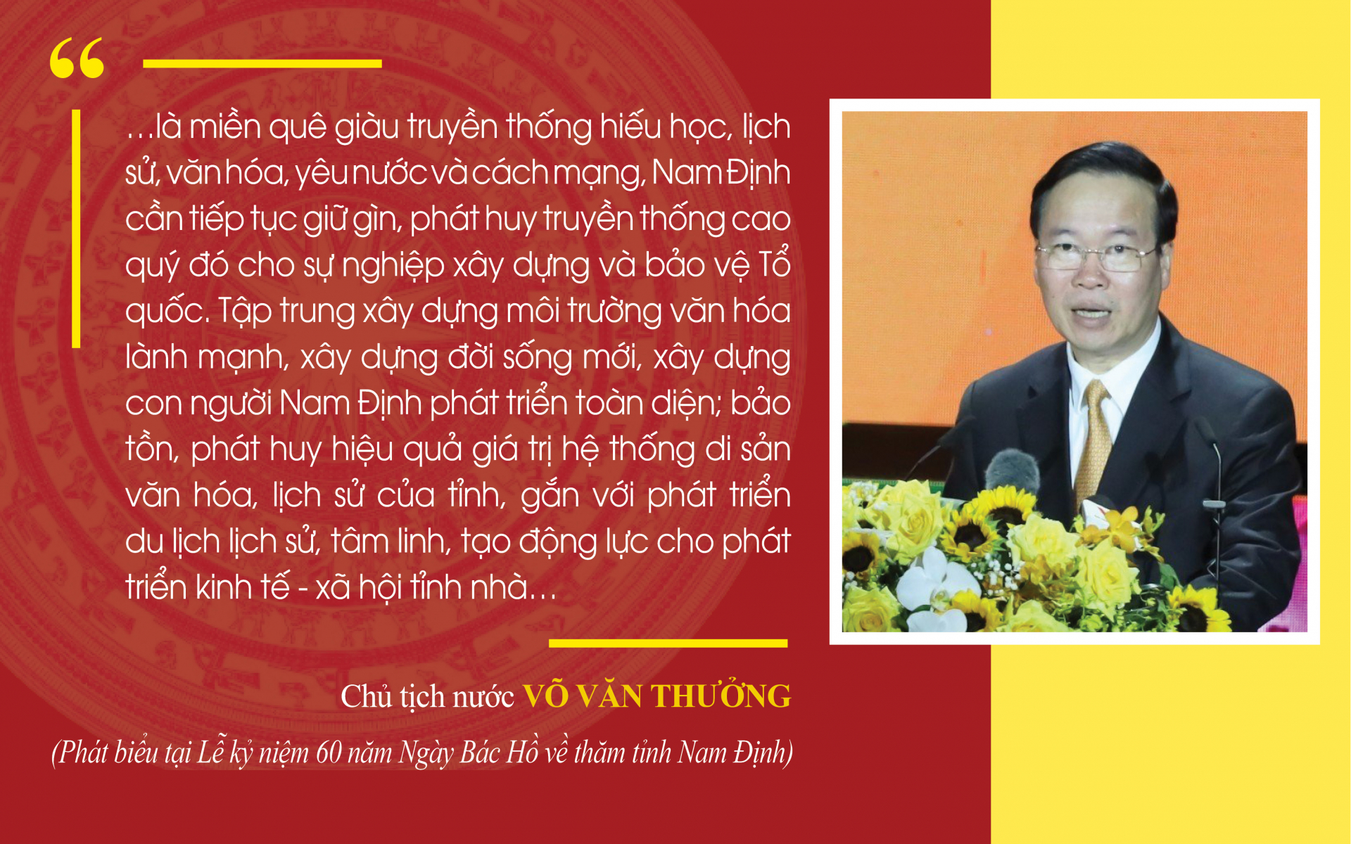 Nam Định là vùng đất văn hiến, “địa linh, nhân kiệt” giàu truyền thống yêu nước, cách mạng. Theo tổng hợp mới nhất của Sở Văn hóa, Thể thao và Du lịch, tính đến hết tháng 3-2023, toàn tỉnh có 1.359 di tích lịch sử - văn hóa, đa dạng về quy mô, độc đáo về kiến trúc nghệ thuật; trong đó có 2 di tích cấp quốc gia đặc biệt (khu di tích Đền Trần - Chùa Phổ Minh và di tích Chùa Keo Hành Thiện), 87 di tích cấp quốc gia, 319 di tích cấp tỉnh, 951 di tích nằm trong danh mục kiểm kê. Công tác quản lý, bảo vệ, tôn tạo các di tích, nhất là các di tích lịch sử cách mạng, kháng chiến trên địa bàn tỉnh là trách nhiệm, là nghĩa vụ thiêng liêng, thực hiện đạo lý “uống nước, nhớ nguồn” của thế hệ hôm nay để gìn giữ các "địa chỉ đỏ" góp phần giáo dục truyền thống văn hóa, lịch sử cách mạng của quê hương.