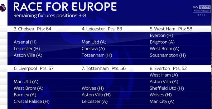 Dù đứng thứ tư, lịch thi đấu còn lại của Leicester khó khăn nhất. Họ gặp ba đội mạnh là Man Utd, Chelsea và Tottenham. Trong trường hợp văng khỏi top 4, giống như câu chuyện ở vòng cuối mùa trước, Leicester vẫn có thể dự Europa League nhờ vị trí thứ năm. Bên cạnh đó, họ cũng còn đường dự giải đấu này khi đánh bại Chelsea ở chung kết Cup FA.