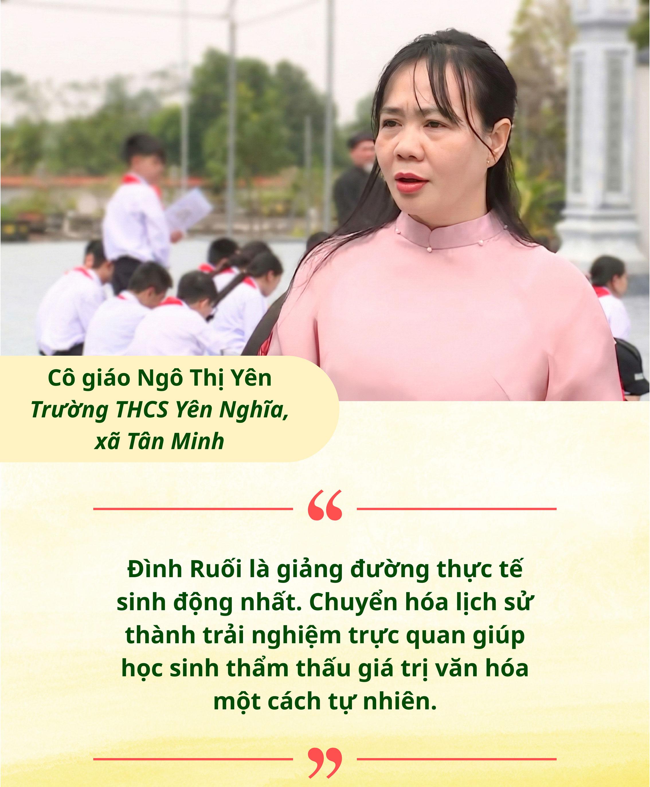 Cô giáo Ngô Thị Yên, Trường THCS Yên Nghĩa cho biết: “Đối với nhà trường, di tích quốc gia Đình Ruối là “giảng đường” thực tế sinh động nhất. Việc chuyển hóa các bài học lịch sử thành trải nghiệm trực quan giúp học sinh thẩm thấu giá trị văn hóa bản địa một cách tự nhiên. Thông qua các hoạt động chăm sóc, bảo vệ cảnh quan, chúng tôi mong muốn khơi dậy trong thế hệ trẻ niềm tự hào nguồn cội và ý thức trách nhiệm gìn giữ di sản của tiền nhân”.