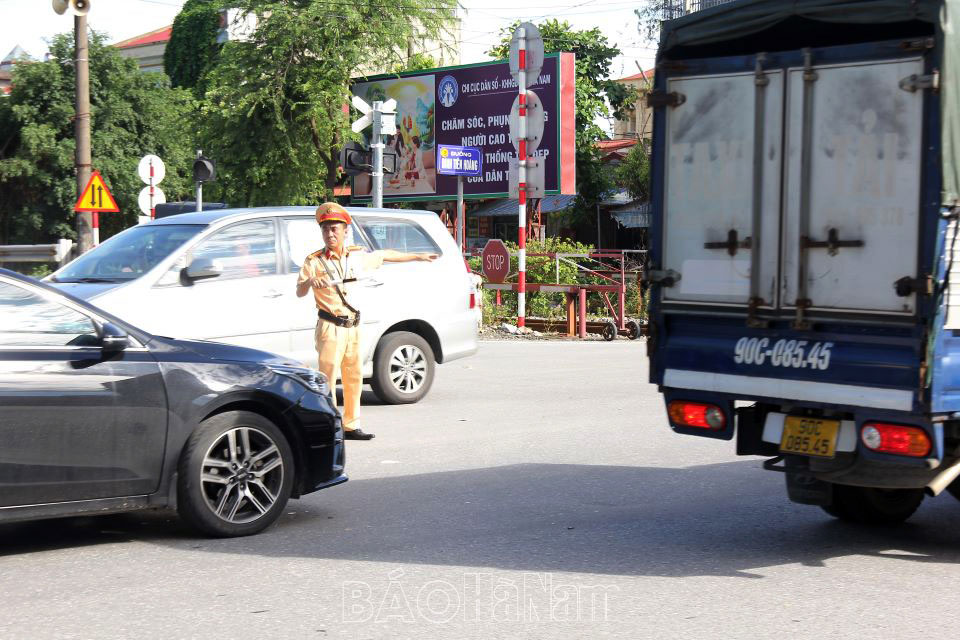 Lực lượng Cảnh sát giao thông Công an tỉnh phân luồng, điều tiết giao thông tại nút giao Liêm Tuyền (thành phố Phủ Lý).