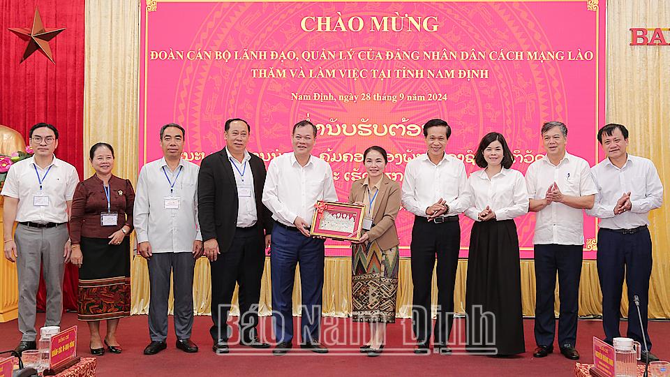 | Các đồng chí lãnh đạo tỉnh Nam Định tặng Đoàn cán bộ lãnh đạo, quản lý của Đảng Nhân dân Cách mạng Lào bức tranh lưu niệm. |
