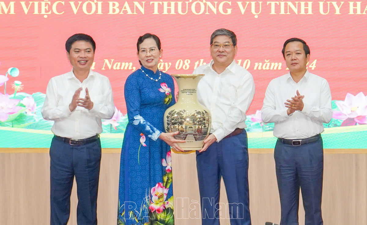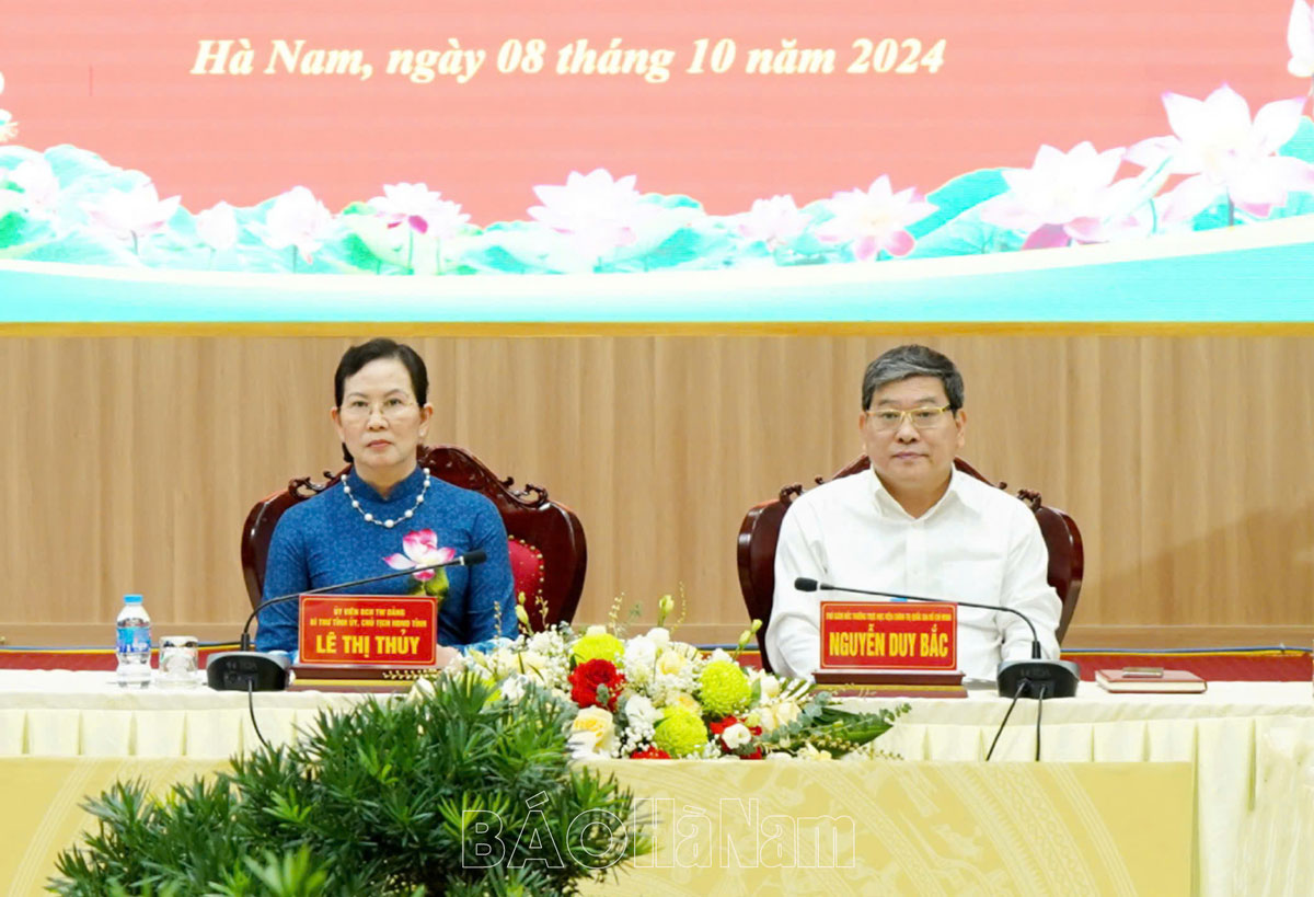 Sáng 8/10, các đồng chí: Lê Thị Thuỷ, Ủy viên Trung ương Đảng, Bí thư Tỉnh ủy, Chủ tịch HĐND tỉnh; Trương Quốc Huy, Phó Bí thư Tỉnh ủy, Chủ tịch UBND tỉnh, Trưởng Đoàn đại biểu Quốc hội tỉnh đã tiếp và làm việc với Đoàn cán bộ, học viên lớp Bồi dưỡng, cập nhật kiến thức kỹ năng đối với cán bộ quy hoạch Ủy viên Ban Chấp hành (BCH) Trung ương Đảng khóa XIV (gọi tắt là lớp Bồi dưỡng) nghiên cứu thực tế tại tỉnh Hà Nam do đồng chí Nguyễn Duy Bắc, Phó Giám đốc Thường trực Học viện Chính trị quốc gia Hồ Chí Minh làm trưởng đoàn.