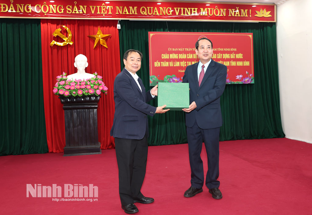 Đề cập đến mối quan hệ hữu nghị truyền thống, tình đoàn kết đặc biệt giữa hai quốc gia Việt Nam - Lào, mối quan hệ gắn bó mật thiết giữa tỉnh Ninh Bình với các địa phương của Lào, đồng chí Phó Chủ tịch Thường trực Ủy ban MTTQ Việt Nam tỉnh hy vọng Đoàn sẽ có buổi làm việc tại Ninh Bình hiệu quả, giúp các thành viên trong Đoàn có cái nhìn thực tiễn về các mô hình kinh tế cộng đồng, về đất nước, con người Việt Nam nói chung cũng như về miền đất cố đô Ninh Bình nói riêng, góp phần thắt chặt tình cảm gắn bó, đoàn kết giữa hai nước Việt Nam - Lào.