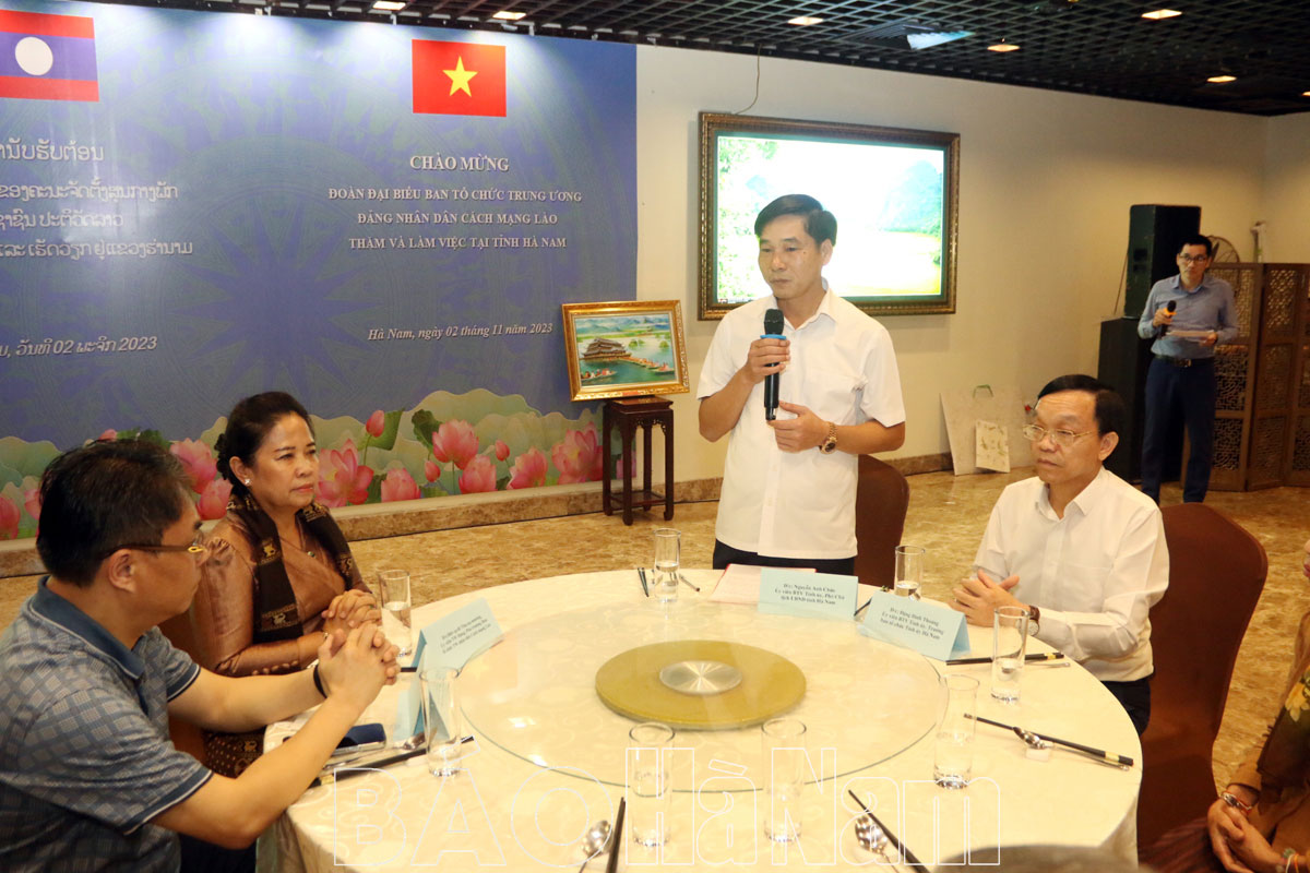 Đoàn công tác Ban Tổ chức Trung ương Đảng Nhân dân Cách mạng Lào và lãnh đạo tỉnh Hà Nam trao đổi tại buổi gặp.