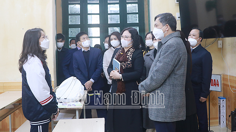 | Đồng chí Phó Chủ tịch UBND tỉnh và đồng chí Ngô Thị Minh, Thứ trưởng Bộ GD và ĐT cùng đoàn công tác của Bộ GD và ĐT kiểm tra công tác đảm bảo phòng chống dịch tại Trường THPT Nguyễn Khuyến (thành phố Nam Định). |