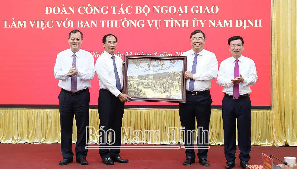 Nhân dịp này, các đồng chí lãnh đạo tỉnh đã trao tặng Bộ Ngoại giao bức tranh Tháp Phổ Minh - biểu tượng lịch sử - văn hóa của quê hương Nam Định./.