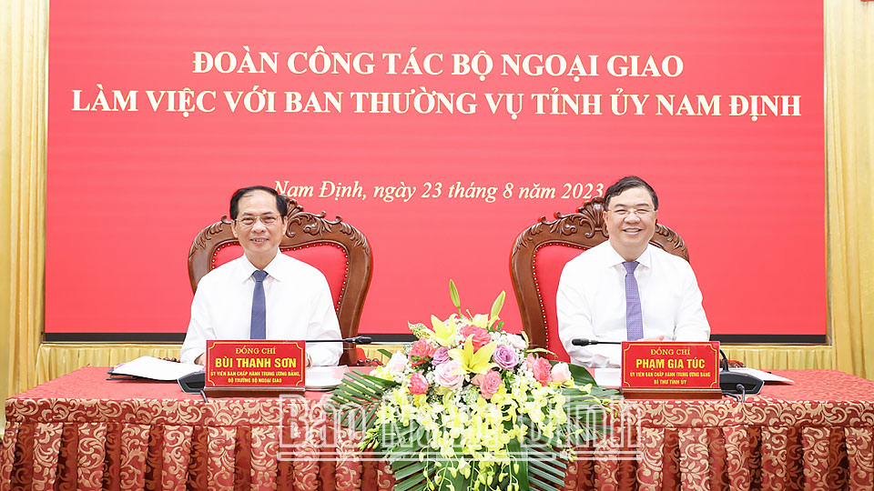 Đồng chí Bí thư Tỉnh ủy trân trọng cảm ơn các đồng chí lãnh đạo Bộ Ngoại giao và cá nhân đồng chí Bộ trưởng Bộ Ngoại giao Bùi Thanh Sơn trong những năm qua đã thường xuyên quan tâm chỉ đạo và giúp đỡ tỉnh Nam Định triển khai thực hiện có hiệu quả các hoạt động đối ngoại; tăng cường, mở rộng quan hệ hữu nghị, hợp tác với các địa phương của nước ngoài đi vào chiều sâu và các nội dung cụ thể; mời được các tập đoàn kinh tế lớn đến đầu tư tại Nam Định. Đồng chí Bí thư Tỉnh ủy cũng mong muốn Bộ Ngoại giao tiếp tục giúp đỡ tỉnh Nam Định, nhất là công tác thông tin về đường lối đối ngoại của Đảng, Nhà nước, tình hình thế giới, khu vực; xu hướng phát triển kinh tế của thế giới; tổ chức tập huấn nâng cao nghiệp vụ cho đội ngũ cán bộ làm công tác đối ngoại.