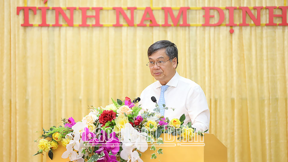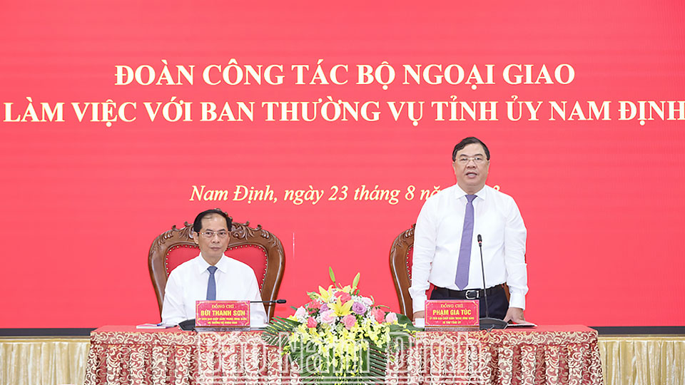 Thay mặt Ban TVTU, đồng chí Bí thư Tỉnh ủy Phạm Gia Túc chúc mừng những đóng góp quan trọng của Bộ Ngoại giao đối với sự phát triển của đất nước đồng thời khẳng định, thời gian qua, tỉnh Nam Định luôn nhận được sự quan tâm lãnh đạo, chỉ đạo của các đồng chí lãnh đạo Đảng, Nhà nước, sự phối hợp chặt chẽ của các Bộ, ngành Trung ương trong đó có Bộ Ngoại giao, vì vậy việc thực hiện các nhiệm vụ phát triển kinh tế - xã hội luôn đạt được kết quả tích cực.