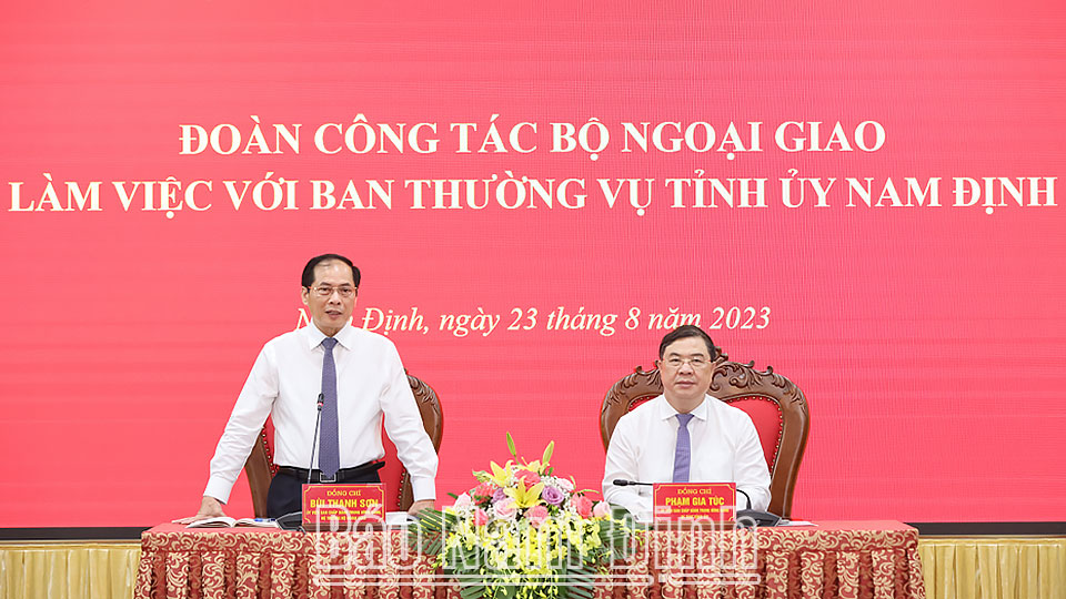 Phát biểu kết luận buổi làm việc, đồng chí Bộ trưởng Bộ Ngoại giao Bùi Thanh Sơn đánh giá cao các kết quả toàn diện mà tỉnh Nam Định đạt được. Đồng chí đề nghị các đơn vị của Bộ Ngoại giao quan tâm giới thiệu, giúp đỡ tỉnh Nam Định quảng bá về nguồn lực đào tạo, bồi dưỡng con người đi kèm với đó là khát vọng, quyết tâm lớn của lãnh đạo từ tỉnh đến cơ sở và nhân dân đối với sự phát triển đi lên của quê hương; hoạt động của tỉnh đã và đang đầu tư rất lớn về cơ sở hạ tầng, hoàn thiện quy hoạch và tầm nhìn lớn để kết nối được với khu vực đồng bằng sông Hồng và những con đường ngắn nhất ra biển, trên không, trên bộ để tạo ra tiềm năng phát triển mạnh mẽ trong thời gian tới; nhu cầu phát triển của tỉnh Nam Định đang chuyển đổi kinh tế từ nông nghiệp sang công nghiệp, nhất là cuộc cách mạng kinh tế xanh, kinh tế số.