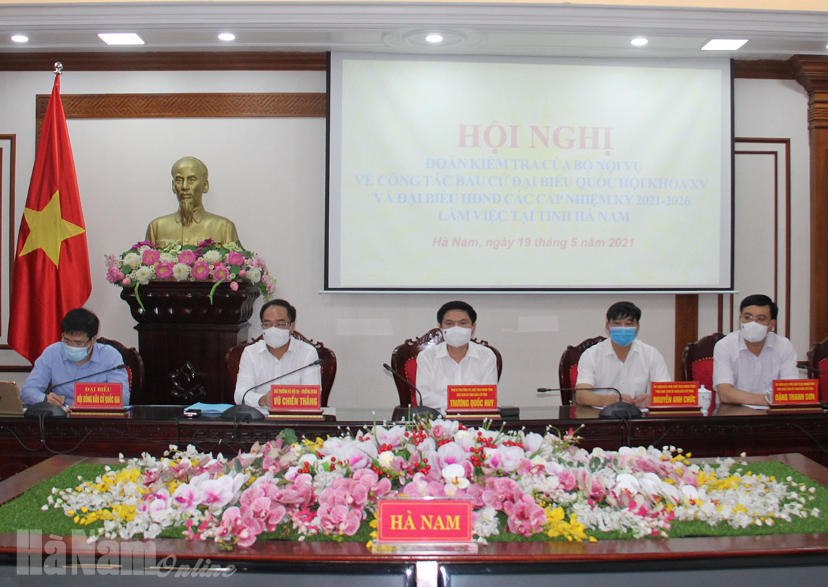 Sáng 19/5, Đoàn công tác của Bộ Nội vụ do Thứ trưởng Vũ Chiến Thắng làm trưởng đoàn đã có buổi làm việc, kiểm tra công tác bầu cử đại biểu Quốc hội(ĐBQH) khóa XV và đại biểu HĐND các cấp nhiệm kỳ 2021-2026 trên địa bàn tỉnh. Làm việc với đoàn có đồng chí Trương Quốc Huy, Phó Bí thư Tỉnh ủy, Chủ tịch UBND tỉnh, Chủ tịch Ủy ban bầu cử (UBBC) tỉnh; các đồng chí Phó chủ tịch và ủy viên UBBC tỉnh; đại diện một số sở, ngành, chủ tịch UBBC các huyện, thị xã, thành phố....