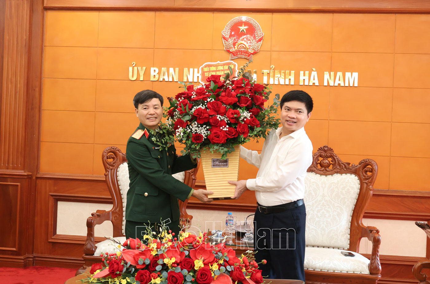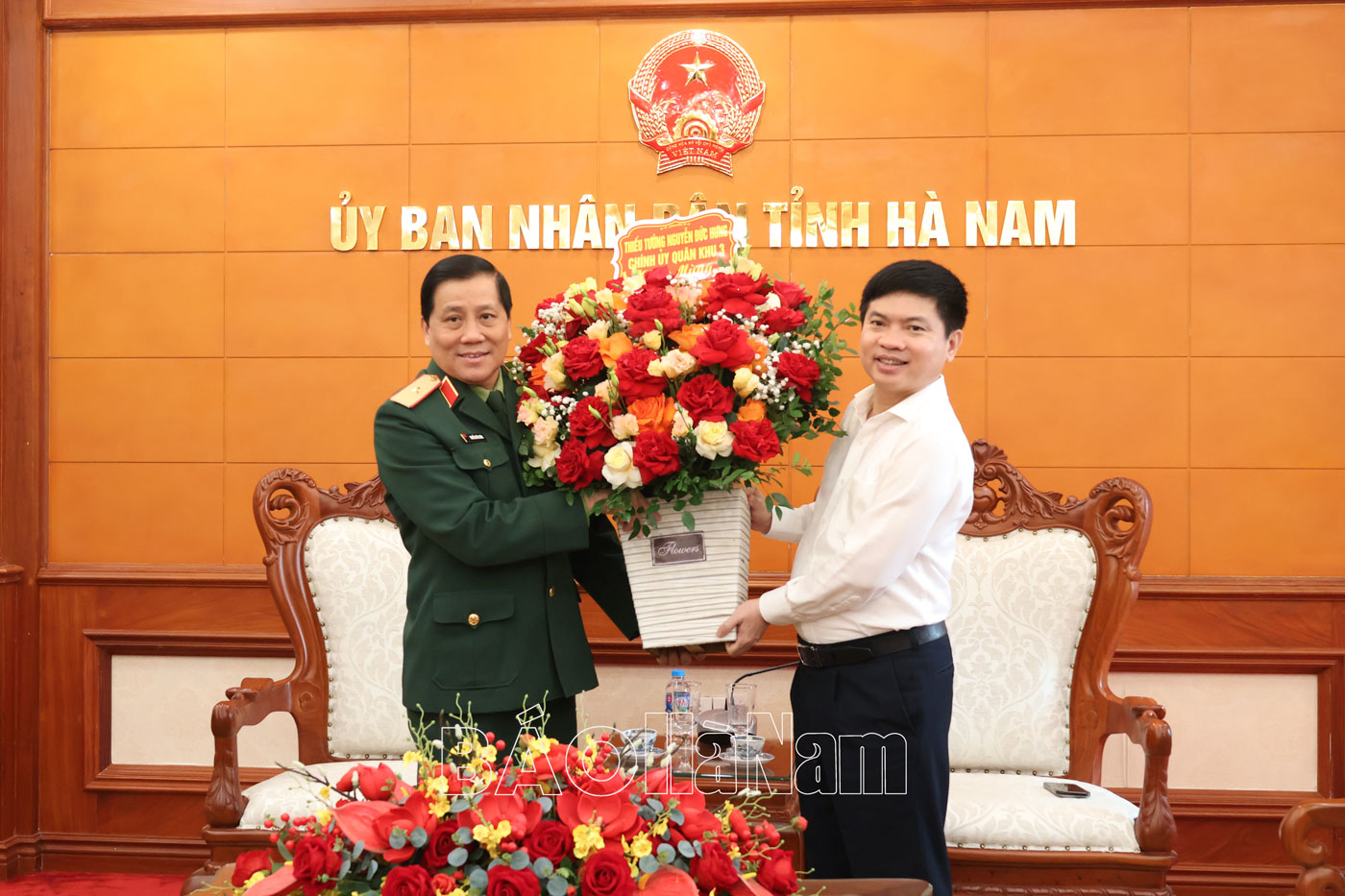 Các đồng chí Thường trực Tỉnh ủy Hà Nam tặng hoa chúc mừng các đồng chí lãnh đạo Quân khu 3.