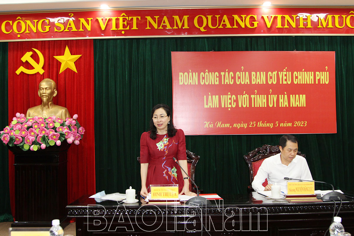 Chiều 25/5, Đoàn công tác của Ban Cơ yếu Chính phủ do Thiếu tướng Nguyễn Đăng Lực, Phó trưởng Ban Cơ yếu Chính phủ làm trưởng đoàn có buổi làm việc với Tỉnh ủy Hà Nam. Đồng chí Đinh Thị Lụa, Phó Bí thư Thường trực Tỉnh uỷ tiếp và làm việc với đoàn. Cùng dự có Đại tá Lường Văn Thắng, Ủy viên BTV Tỉnh ủy Chỉ huy trưởng Bộ CHQS tỉnh; lãnh đạo một số sở, ban, ngành liên quan; cán bộ phụ trách cơ yếu các đơn vị: Bộ CHQS tỉnh, Công an tỉnh, Viện Kiểm sát Nhân dân tỉnh, Văn phòng Tỉnh ủy.
