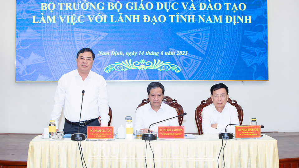 Phát biểu tại hội nghị, đồng chí Bí thư Tỉnh ủy Phạm Gia Túc trân trọng cảm ơn đồng chí Bộ trưởng và Đoàn công tác của Bộ GD và ĐT đã quan tâm tới công tác GD và ĐT của tỉnh và mong rằng trong thời gian tới, tỉnh Nam Định tiếp tục nhận được sự quan tâm, giúp đỡ, hỗ trợ của Bộ GD và ĐT. Tỉnh sẽ tiếp thu đầy đủ các ý kiến chỉ đạo của đồng chí Bộ trưởng tại buổi họp hôm nay, xây dựng thành chương trình, kế hoạch để phát triển GD và ĐT của tỉnh trong thời gian tới, tiếp nối truyền thống 28 năm dẫn đầu toàn quốc về chất lượng GD và ĐT. Lãnh đạo tỉnh sẽ tạo mọi điều kiện tốt nhất để ngành GD và ĐT chăm lo cho học sinh.