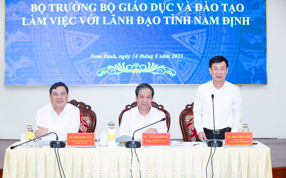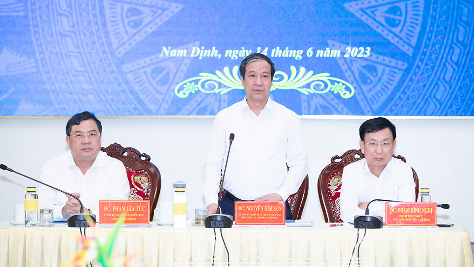 Đồng chí Bộ trưởng Bộ GD và ĐT Nguyễn Kim Sơn ghi nhận kết quả đạt được của tỉnh Nam Định trên các mặt kinh tế - xã hội, đặc biệt là lĩnh vực GD và ĐT; cảm ơn sự quan tâm của lãnh đạo tỉnh đối với công tác giáo dục trên địa bàn. Trong bức tranh chung giáo dục của vùng đồng bằng Bắc Bộ, Nam Định là điểm sáng, giàu truyền thống và thành tựu trên các phương diện: giáo dục đại trà, mũi nhọn, phổ cập, các chỉ số thông qua kỳ thi tốt nghiệp hàng năm, tỷ lệ học sinh giỏi các cấp. Đặc biệt, quá trình triển khai Chương trình GDPT 2018, tỉnh đã có những chỉ đạo triển khai thực hiện đúng theo kế hoạch, tiến độ chung... Thời gian tới, đề nghị tỉnh tiếp tục quan tâm chỉ đạo huy động các nguồn lực cho việc thực hiện Chương trình GDPT 2018. Tập trung chuẩn bị cho việc triển khai chương trình giáo dục mầm non mới trên địa bàn tỉnh và chuẩn bị các điều kiện, dự kiến cuối năm 2024, đầu năm 2025 đưa vào triển khai đại trà. Về tình trạng thiếu giáo viên, đề nghị tỉnh và Sở tiếp tục kiến nghị từ góc độ của địa phương, để ngành tập hợp, báo cáo Chính phủ sớm giải quyết, khắc phục. Sở GD và ĐT cần truyền thông mạnh mẽ hơn nữa để phụ huynh và xã hội cùng đồng hành thực hiện Chương trình GDPT mới. Các sở, ngành khác cũng cần chia sẻ khó khăn với ngành GD và ĐT tỉnh. Huy động mọi nguồn lực xã hội tham gia công tác đổi mới GD và ĐT. Về Trường CĐSP Nam Định, Vụ Giáo dục đại học nghiên cứu cùng địa phương để giải quyết, cố gắng có phương án hợp lý. Riêng về Kỳ thi tốt nghiệp THPT 2023, Bộ trưởng lưu ý việc in sao đề thi bảo đảm theo quy định và rà soát cho chặt chẽ. Tổ chức tập huấn cán bộ làm công tác thi; vấn đề an toàn, an ninh, phòng cháy chữa cháy, bảo đảm điện phục vụ kỳ thi; phòng chống gian lận thi cử bằng các hình thức công nghệ cao, nêu cao tinh thần trách nhiệm của giáo viên để nhắc nhở học sinh chấp hành quy định.