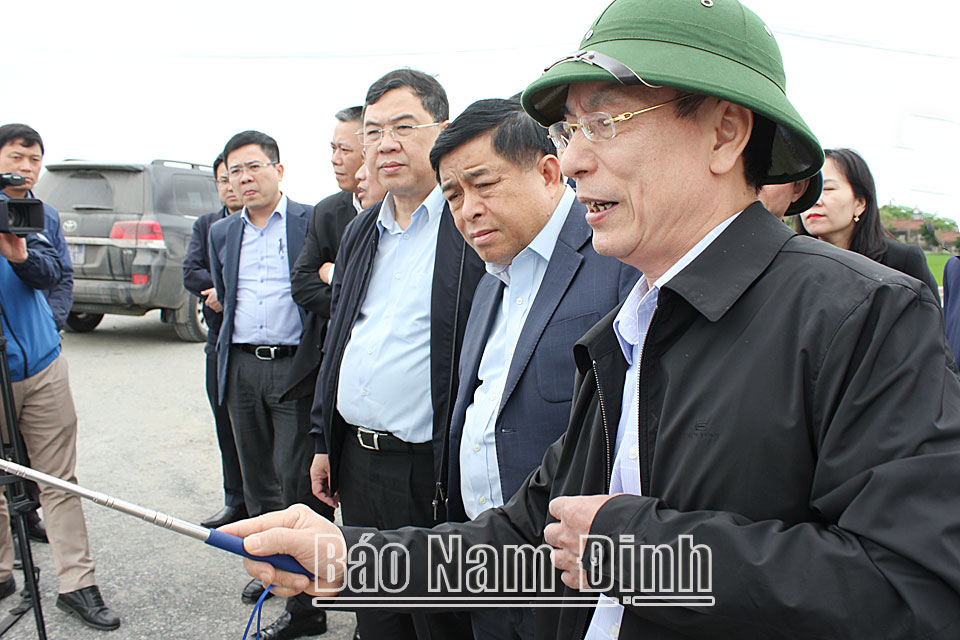 | Đồng chí Phạm Đình Nghị, Phó Bí thư Tỉnh uỷ, Chủ tịch UBND tỉnh báo cáo tiến độ dự án xây dựng tuyến đường bộ ven biển đoạn qua tỉnh Nam Định tại địa phận huyện Giao Thuỷ. |