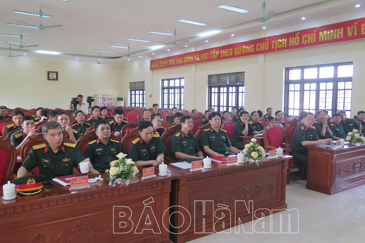 Đoàn công tác tham quan Ban CHQS thành phố Phủ Lý.Đại tá Trần Quốc Tiến, Chủ nhiệm Hậu cần Quân khu 3 phát biểu tại hội nghị.