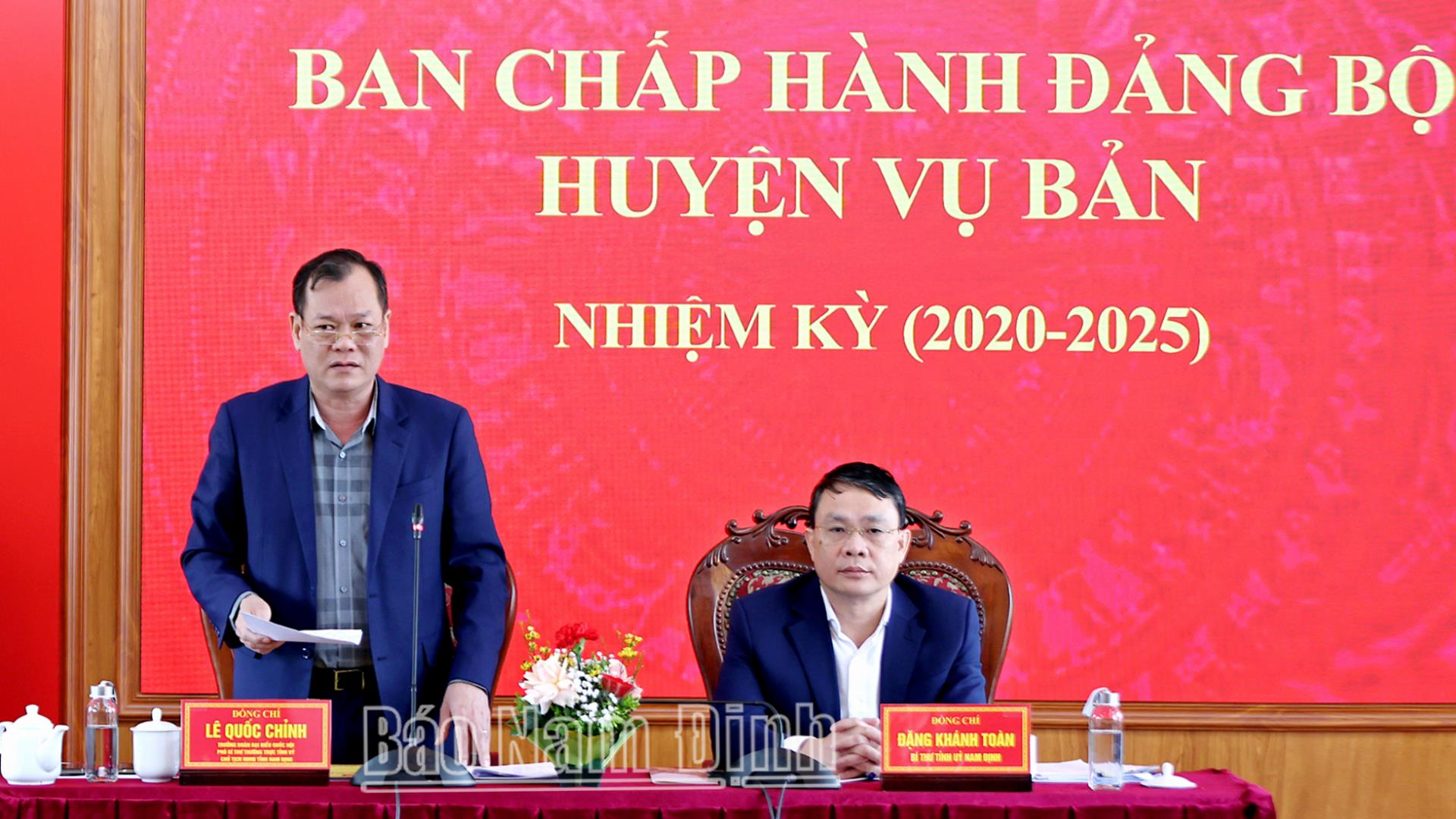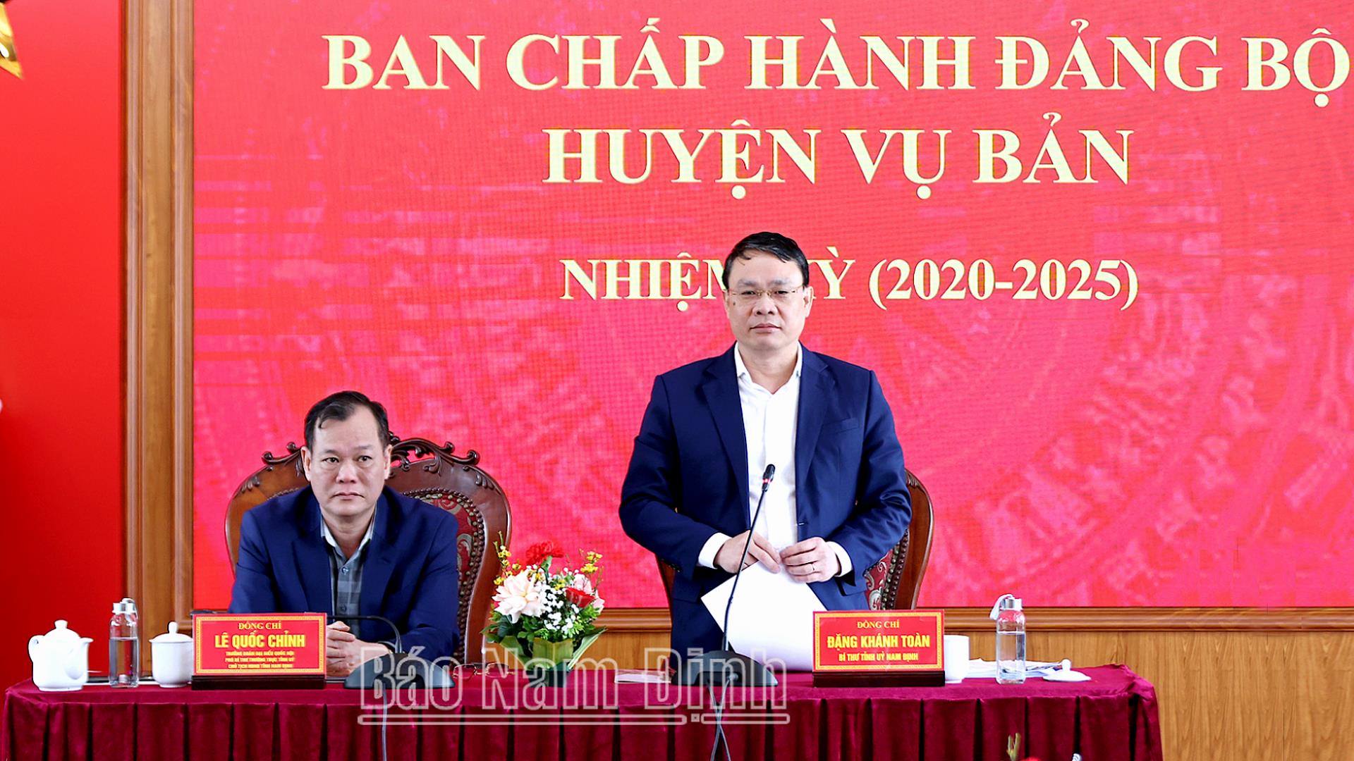 Phát biểu chỉ đạo tại buổi làm việc, đồng chí Bí thư Tỉnh uỷ Đặng Khánh Toàn ghi nhận, biểu dương những nỗ lực, cố gắng của huyện Vụ Bản đạt được thời gian qua; đồng thuận với định hướng phát triển của địa phương trong những năm tới. Đồng chí Bí thư Tỉnh ủy đề nghị Ban Thường vụ Huyện ủy Vụ Bản tiếp thu nghiêm túc các ý kiến mà Đoàn công tác của tỉnh đã gợi mở, làm căn cứ, định hướng, mục tiêu phát triển của huyện thời gian tới.
