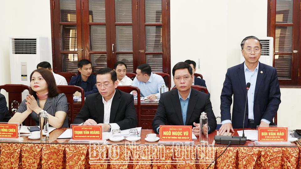 Tại buổi làm việc, đồng chí Bí thư Huyện ủy Bùi Văn Hảo báo cáo với Đoàn công tác các nội dung liên quan. Theo đó, từ đầu nhiệm kỳ 2020-2025 đến nay, Đảng bộ, chính quyền và nhân dân huyện luôn nỗ lực phấn đấu, khắc phục khó khăn, hoàn thành thắng lợi các chỉ tiêu, nhiệm vụ chủ yếu theo Nghị quyết Đại hội Đảng bộ huyện lần thứ XXIV đề ra. Điểm nổi bật là công tác quy hoạch triển khai quyết liệt, đồng bộ giữa cấp, ngành và giữa quy hoạch chung với quy hoạch chi tiết, tạo tiền đề quan trọng cho phát triển kinh tế - xã hội, đảm bảo quốc phòng, an ninh. Hạ tầng kinh tế - xã hội tiếp tục được tập trung đầu tư xây dựng, nâng cấp ở hầu khắp các lĩnh vực, địa bàn theo hướng chuẩn hóa, hiện đại, đồng bộ và kết nối, góp phần làm thay đổi căn bản bộ mặt nông thôn, phục vụ đắc lực cho sự phát triển và nâng cao đời sống nhân dân. Cơ cấu kinh tế chuyển dịch theo hướng tích cực; tăng tỷ trọng nhóm ngành công nghiệp, xây dựng, dịch vụ, giảm tỷ trọng nông nghiệp. Đến nay, tỷ trọng công nghiệp, xây dựng, dịch vụ trong cơ cấu kinh tế chiếm 92,17%. Tốc độ tăng trưởng giá trị sản xuất công nghiệp, xây dựng bình quân giai đoạn 2020-2025 ước đạt 12,91%/năm. Giá trị sản xuất công nghiệp, xây dựng năm 2025 (giá so sánh 2010) ước đạt 14.432 tỷ đồng, tăng 6.568 tỷ đồng so với năm 2020.