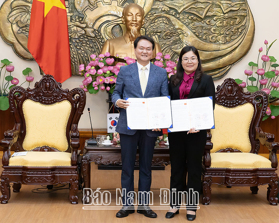 | Đồng chí Hà Lan Anh, TUV, Phó Chủ tịch UBND tỉnh trao đổi các Thoả thuận hợp tác về lao động thời vụ nước ngoài trong lĩnh vực nông nghiệp giữa tỉnh Nam Định và tỉnh Jeju (Hàn Quốc). |