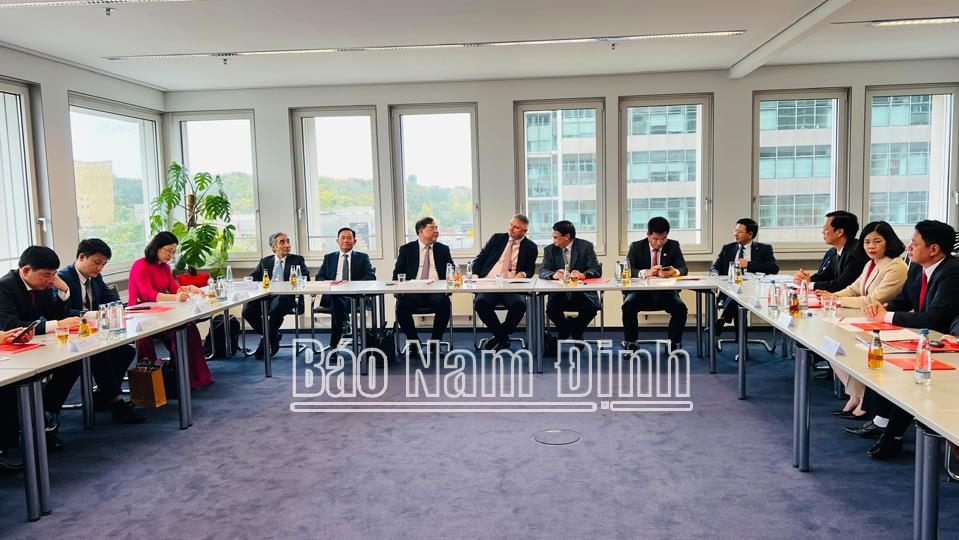 Sáng 23-10, Đoàn công tác đến thăm và làm việc với lãnh đạo Tập đoàn Reifenhäuser tại thành phố Bonn; tham quan hệ thống sản xuất màng bọc polymer và nghe giới thiệu tổng thể về quy mô của Tập đoàn trên toàn cầu. Ngày 24-10, Đoàn tham gia Hội thảo xúc tiến đầu tư với Đại sứ quán Việt Nam tại CHLB Đức; làm việc với Hiệp hội Doanh nghiệp vừa và nhỏ tại Đức; gặp gỡ Hội người Nam Định tại Cộng hòa Liên bang Đức.