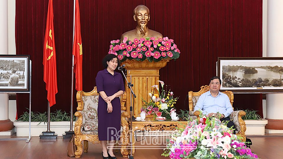 | Các đồng chí: Phạm Gia Túc, Ủy viên BCH Trung ương Đảng, Bí thư Tỉnh ủy; Nguyễn Thị Hương, Tổng cục trưởng Tổng cục Thống kê tại buổi làm việc.